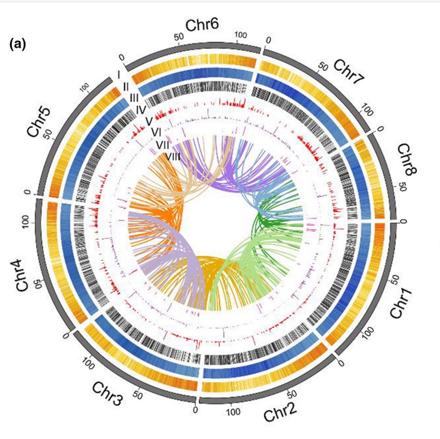 作者利用三代Nanopore、二代Illumina測(cè)序技術(shù)以及Hi-C技術(shù)測(cè)序組裝獲得一個(gè)高質(zhì)量染色體水平的黃花棘豆基因組:其基因組大小為930.94 Mb,contig N50為1.40 Mb,scaffold N50為121.79 Mb,共注釋到31,700個(gè)蛋白質(zhì)編碼基因。利用三代Nanopore和二代Illumina測(cè)序技術(shù)測(cè)序組裝獲得一個(gè)高質(zhì)量的棘豆鏈格孢菌基因組:其基因組大小為74.48 Mb,contig N50為8.87Mb,共注釋到10,657個(gè)蛋白質(zhì)編碼基因。