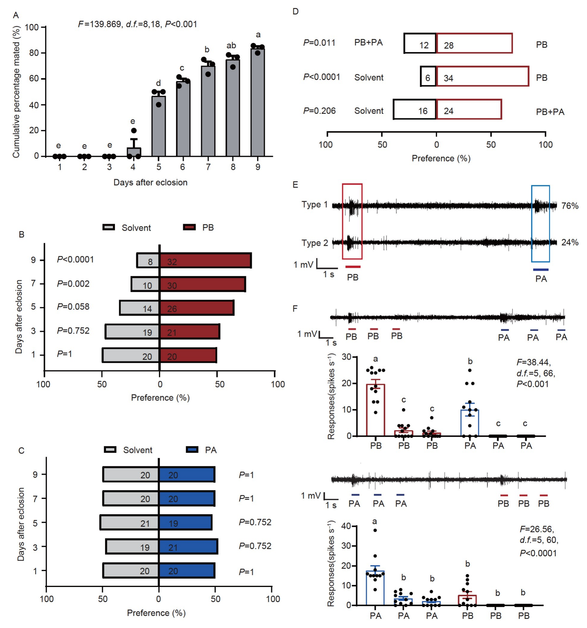 研究團(tuán)隊(duì)使用Y型管嗅覺(jué)儀對(duì)不同日齡的雄蟲(chóng)進(jìn)行了行為學(xué)測(cè)試,以觀察它們對(duì)PB和PA的反應(yīng)。此外,通過(guò)視頻記錄和分析,評(píng)估了雄蟲(chóng)的交配行為。交配率在5 DAE時(shí)增加到近50%,6 DAE時(shí)增加到60%以上,此后緩慢而穩(wěn)定地積累(圖1A)。雄蟲(chóng)對(duì)PB和PA的偏好測(cè)試結(jié)果反應(yīng),PB是主要的性信息素成分,能夠顯著吸引雄蟲(chóng)。而PA雖然單獨(dú)存在時(shí)不吸引雄蟲(chóng),但其存在能夠減弱PB的吸引作用(圖1B-D),表明PA可能在調(diào)節(jié)性行為中起到平衡作用。