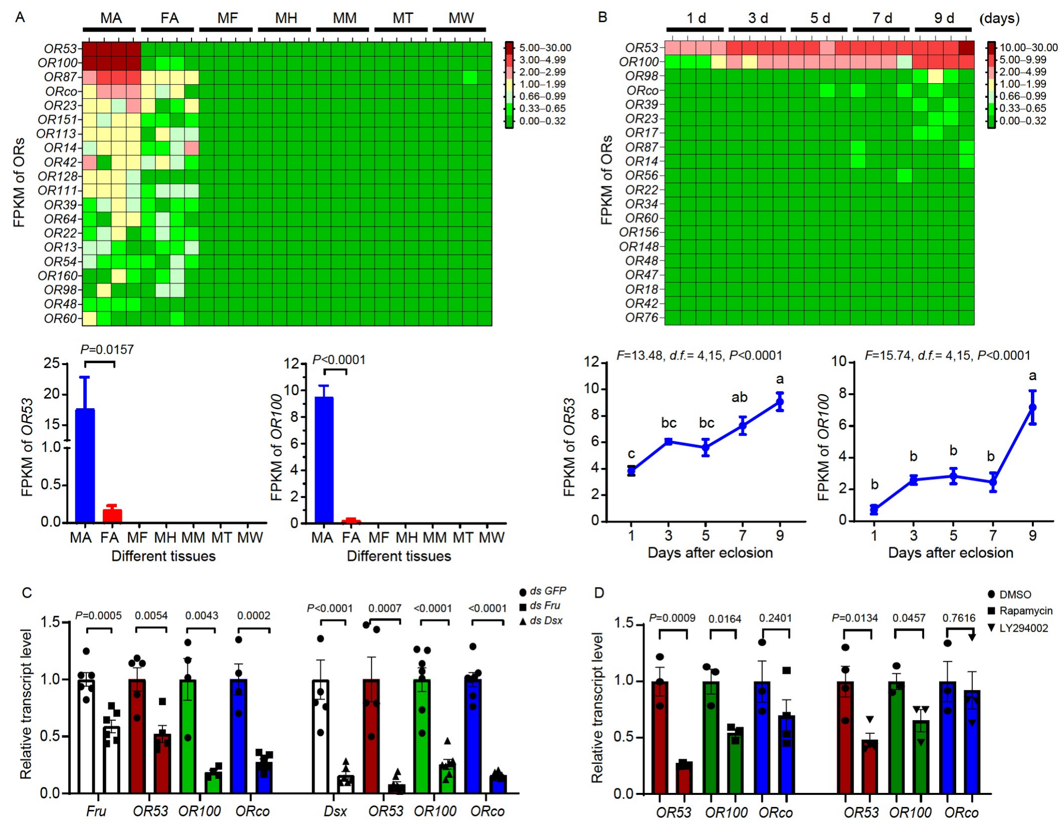 研究人員利用Bulk RNA測(cè)序技術(shù)分析了雄蟲(chóng)不同組織中嗅覺(jué)受體基因的表達(dá)情況,并通過(guò)果蠅遺傳學(xué)方法,將美洲大蠊的嗅覺(jué)受體基因在果蠅中表達(dá),以鑒定PA和PB的受體。通過(guò)RNA測(cè)序分析得到的嗅覺(jué)受體基因在不同組織(雄蟲(chóng)觸角-MA、雌蟲(chóng)觸角-FA、雄蟲(chóng)前足-MF、雄蟲(chóng)頭部-MH、雄蟲(chóng)口器-MM、雄蟲(chóng)精巢-MT和雄蟲(chóng)翅-MW)和不同日齡中的表達(dá)水平(圖2A、2B),以及通過(guò)qPCR驗(yàn)證的OR53、OR100ORco基因在雄蟲(chóng)觸角中敲除frudsx基因后的表達(dá)水平(圖2C),以及經(jīng)過(guò)營(yíng)養(yǎng)信號(hào)通路抑制劑處理后的表達(dá)水平變化(圖2D)。研究鑒定出OR53OR100為PA/PB和PA的受體,并發(fā)現(xiàn)它們?cè)谛巯x(chóng)觸角中的表達(dá)模式與行為測(cè)定結(jié)果相吻合,證實(shí)了這兩種受體在性信息素感知中的關(guān)鍵作用。