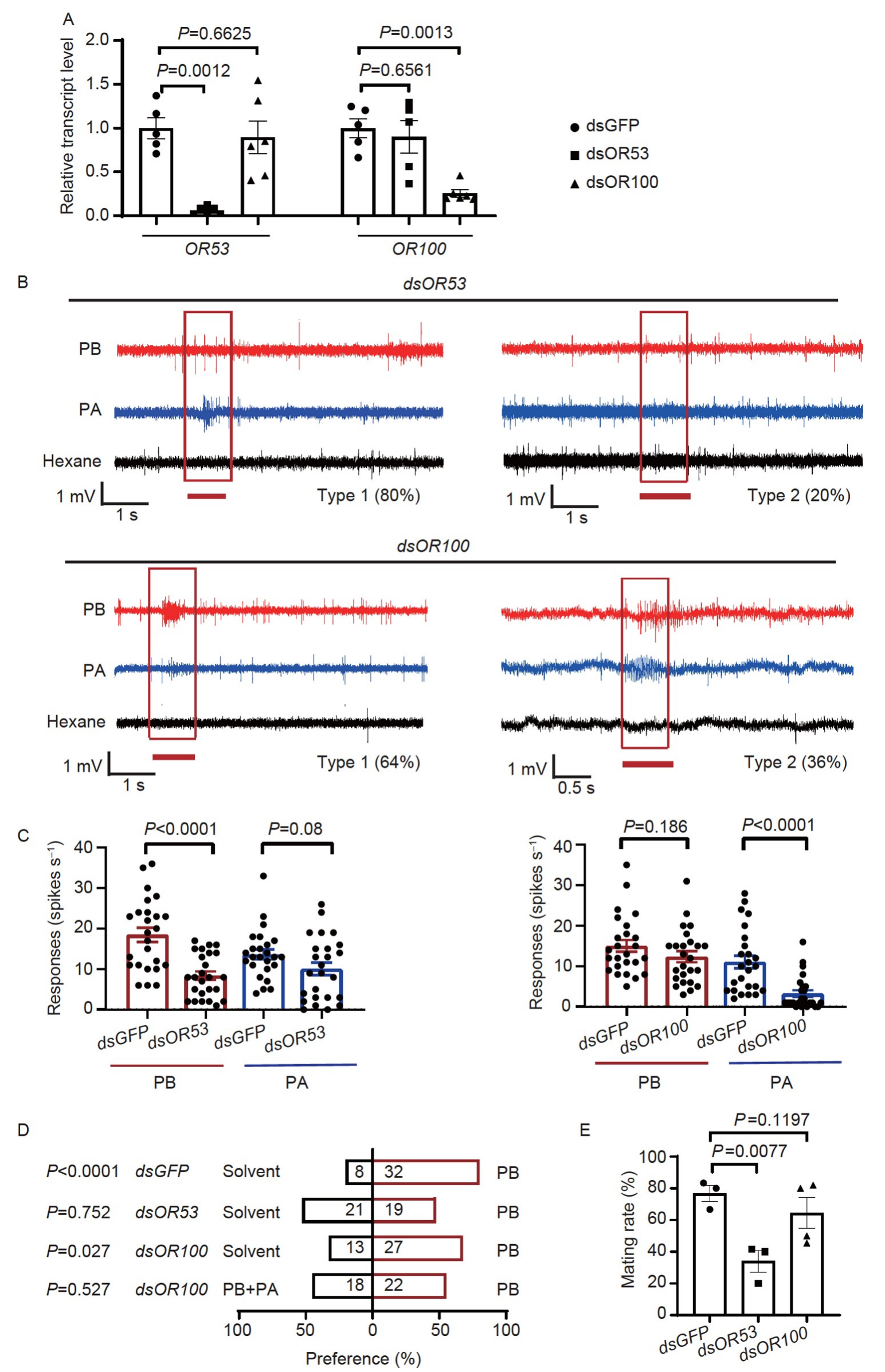 研究人員利用UAS-OR53UAS-OR100轉(zhuǎn)基因果蠅品系,通過(guò)RNAi實(shí)驗(yàn)敲除了美洲大蠊中的OR53OR100基因,進(jìn)而研究這些嗅覺(jué)受體在求偶交配行為中的作用。敲除這些基因后對(duì)PA和PB反應(yīng)的SSR測(cè)試結(jié)果,敲低OR53的表達(dá)顯著削弱了ORN對(duì)PB的反應(yīng),但對(duì)ORN對(duì)PA的反應(yīng)只有輕微的影響(圖3B)。OR53OR100基因敲除對(duì)雄蟲(chóng)行為選擇和交配率的影響(圖3D、3E)。敲除實(shí)驗(yàn)證實(shí)了OR53OR100在性信息素感知和行為調(diào)控中的關(guān)鍵作用,特別是OR53在PB誘導(dǎo)的求偶交配行為中的重要性。OR100的敲除則表明PA可能通過(guò)OR100發(fā)揮調(diào)節(jié)作用。