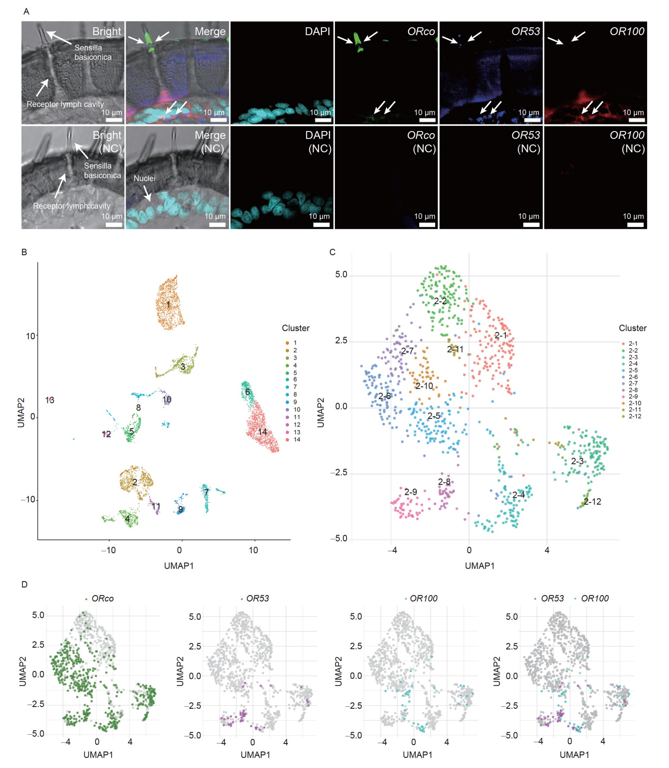 研究人員利用FISH技術(shù),觀察到OR53、OR100ORco經(jīng)常在同一個(gè)感受器中表達(dá),說(shuō)明大多數(shù)基本感受器同時(shí)含有OR53OR100的ORN。為了更系統(tǒng)地研究OR基因的表達(dá),研究人員使用性成熟雄蟲(chóng)的觸角進(jìn)行了單細(xì)胞測(cè)序。測(cè)定每簇細(xì)胞的基因表達(dá)水平,鑒定出Cluster 2為ORco高表達(dá)的ORN(圖4B)。進(jìn)一步分析Cluster 2細(xì)胞得到12個(gè)亞型(圖4C)。其中大部分感受器同時(shí)具有OR53OR100兩種OR53 ORNs,而少數(shù)感受器僅具有OR53?ORNs。12個(gè)亞型中有4個(gè)同時(shí)表達(dá)OR53OR100,可能對(duì)應(yīng)于主要的1-型感受器的ORNs。在2-亞型中,還發(fā)現(xiàn)了OR53的顯著表達(dá)亞型,可能對(duì)應(yīng)2型感受器的ORNs,也可能只有少量的感受器OR100?ORNs(圖4D)。這些結(jié)果進(jìn)一步支持了性成熟雄蟲(chóng)觸角中至少存在兩種錐形感受器。