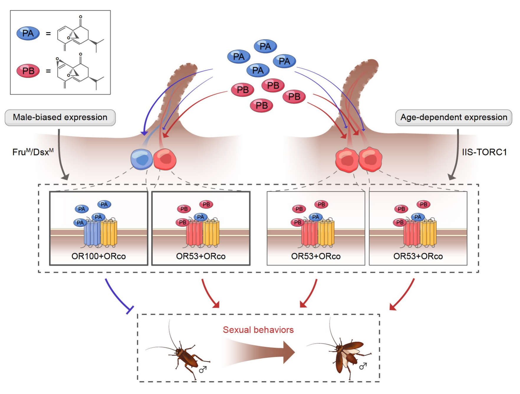 研究結(jié)果表明,PB作為主要的性信息素成分,通過(guò)激活OR53受體來(lái)誘導(dǎo)雄蟲(chóng)的求偶交配行為。而PA雖然單獨(dú)存在時(shí)不吸引雄蟲(chóng),但其存在能夠通過(guò)兩種可能的途徑減弱PB的吸引作用:一是PA與PB競(jìng)爭(zhēng)激活相同的受體OR53,二是PA通過(guò)激活其特定的受體OR100來(lái)抑制性行為。該研究確定了兩種性信息素嗅覺(jué)受體以及可能調(diào)控雄蟲(chóng)特異性和年齡依賴性求偶交配行為的分子機(jī)制,有助于發(fā)展綠色防蟑技術(shù)及害蟲(chóng)綜合管理策略。