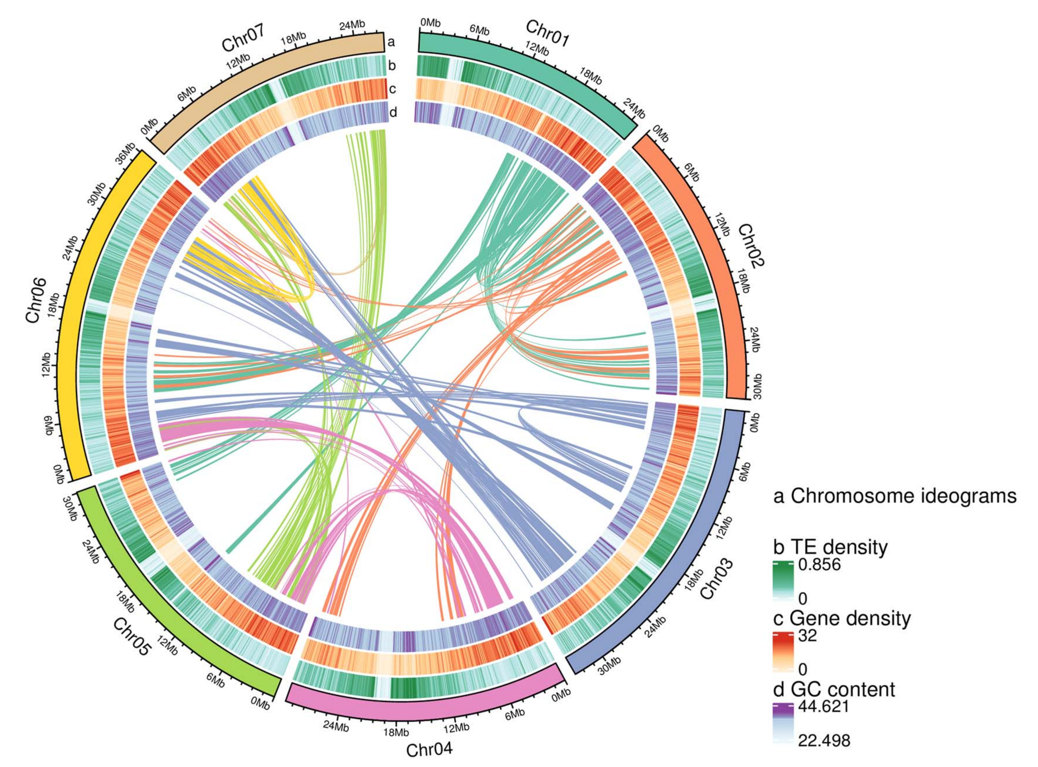 利用這些有效的互作讀對對初步的基因組草圖進(jìn)行校正,得到了總共221.95 Mb的最終草圖,包含138個(gè)contigs (N50 = 16.13 Mb)。這些contigs進(jìn)一步聚集成131個(gè)支架(N50 = 30.0 Mb)。70個(gè)支架共219.02 Mb,占總組裝序列的98.68%,占估計(jì)基因組大小的99.33%,錨定在7條假染色體上。其中,20個(gè)支架(211.23 Mb)的位置和方向被確定,占錨定序列的96.44%。通過blast of essential genes (CEG)數(shù)據(jù)庫和BUSCO數(shù)據(jù)庫來估計(jì)該草圖基因組的組裝完整性,共鑒定出458個(gè)CEG的456個(gè)同源物(99.56%)和1614個(gè)BUSCO的1590個(gè)同源物(98.51%)。這些結(jié)果表明,組裝的空心藨基因組草圖具有較高的完整性。綜合各組組或支架的組裝完整性、無間隙度、N50等指標(biāo),該研究組裝的草圖基因組超過了其他覆盆子物種。