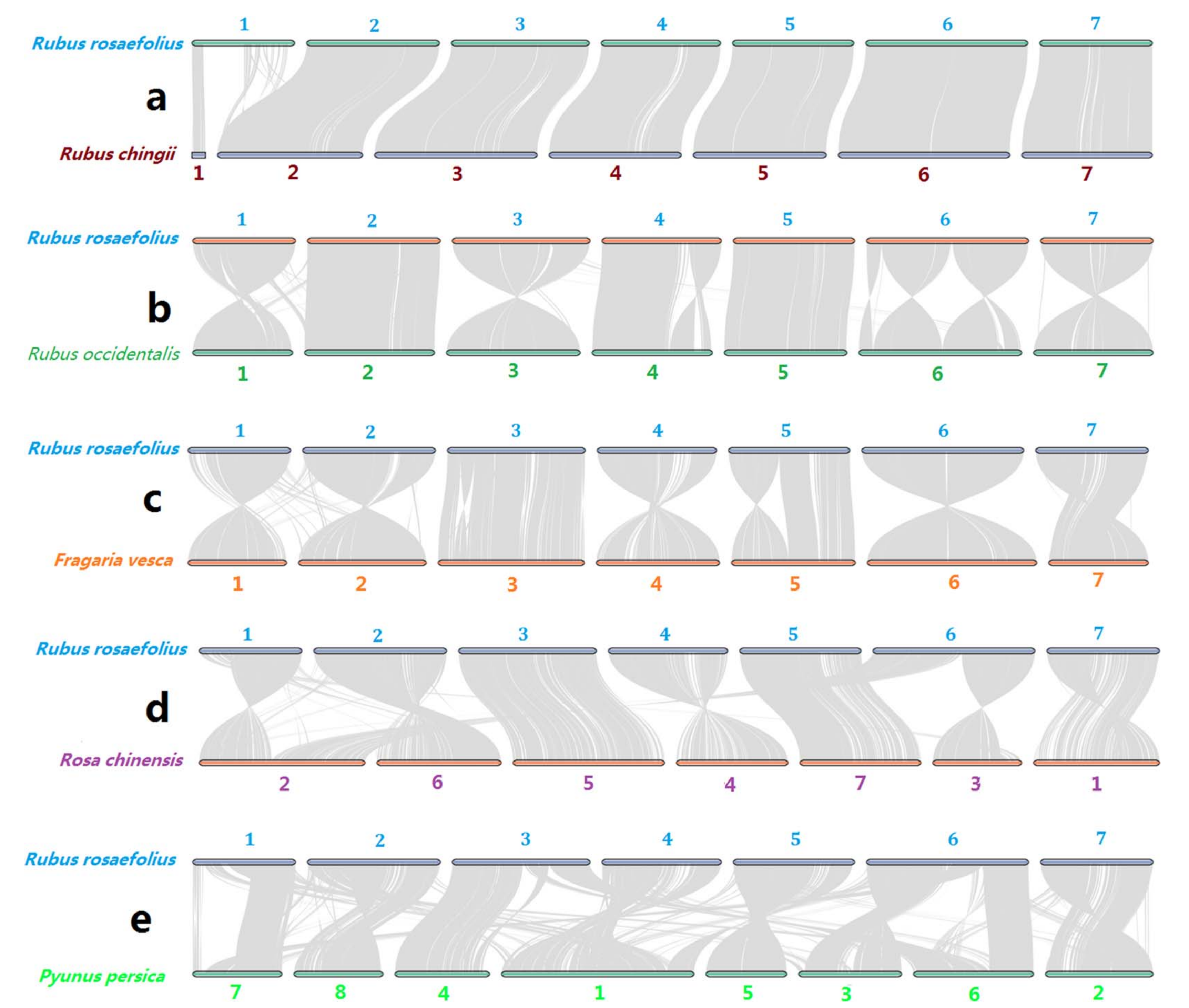 所有的植物都有一個(gè)或遠(yuǎn)或近的共同祖先。通過共線性分析發(fā)現(xiàn):在1號染色體的一端和其他6條染色體上,發(fā)現(xiàn)了完整且平行的同源物,但在1號染色體的另一端缺失了大同源塊(圖3a)。這些結(jié)果表明,空心藨和紅覆盆子之間沒有發(fā)生大的染色體變異,但在空心藨和紅覆盆子基因組草圖的組裝或注釋中隱藏了錯(cuò)誤。該研究發(fā)現(xiàn),空心藨和紅覆盆子之間所有染色體的共線性幾乎是完整的(圖3b),這表明上述1號染色體的組裝或注釋錯(cuò)誤可能在空心藨中沒有發(fā)生。當(dāng)忽略單倍型中支架組裝方向的干擾時(shí),1、2、3、5、7號染色體幾乎完全平行共線性,4號染色體可能發(fā)生較大反轉(zhuǎn),6號染色體可能發(fā)生3次或更少的反轉(zhuǎn)(圖3b)。這些發(fā)現(xiàn)表明,隨著親緣關(guān)系距離的增加,復(fù)雜染色體變異的數(shù)量增加。