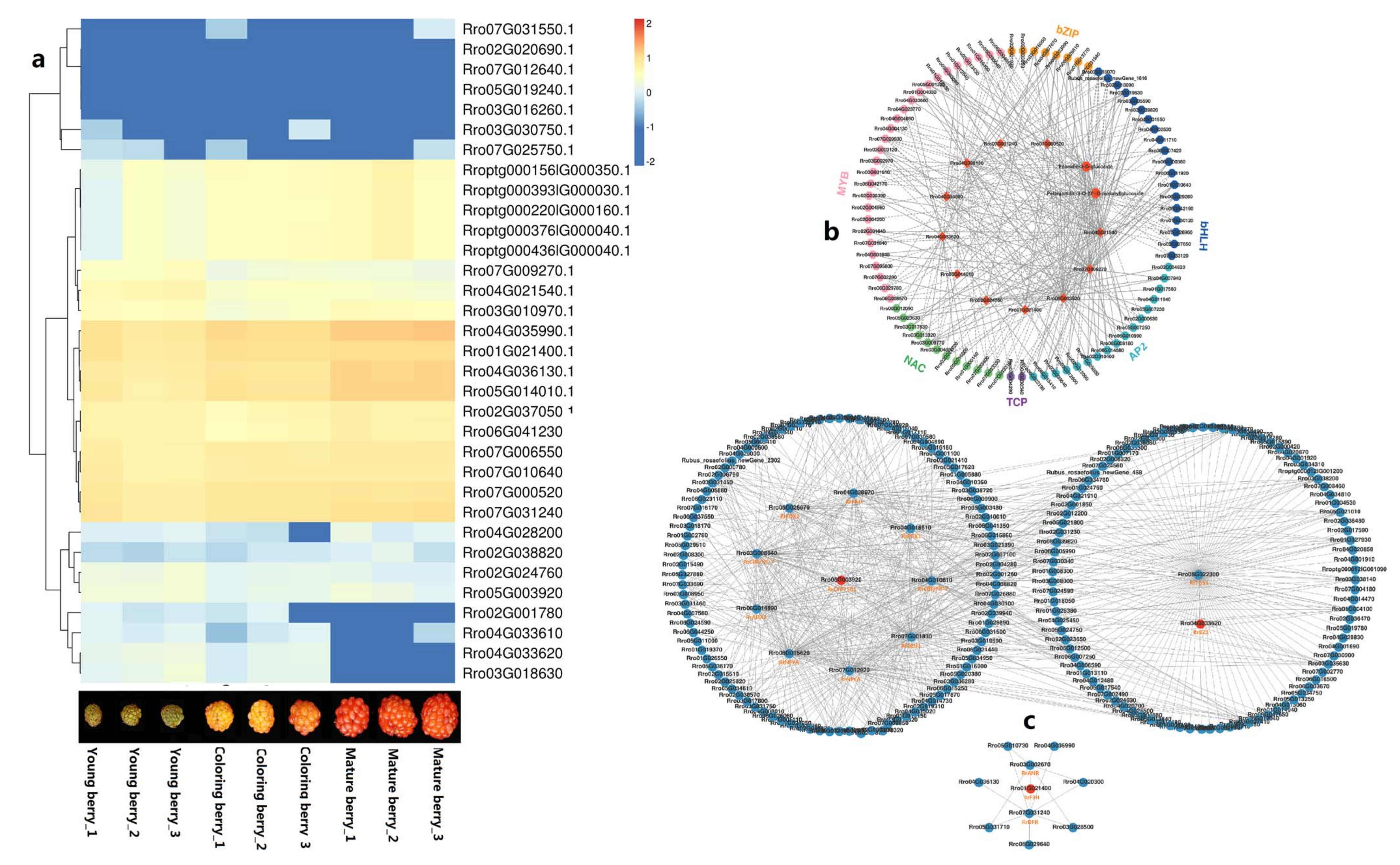 為了探索空心藨紅漿果中花青素生物合成調(diào)控的分子機(jī)制,該研究對空心藨紅漿果幼齡期和成熟期的轉(zhuǎn)錄組和代謝組進(jìn)行了相關(guān)性分析。在成熟漿果中發(fā)現(xiàn)的主要花青素——芍藥苷-3-O-葡萄糖苷和芍藥苷-3-O-(6’’-O-丙二?;?葡萄糖苷被鑒定為顯著差異積累代謝產(chǎn)物(DAMs),其中11個(gè)結(jié)構(gòu)基因被發(fā)現(xiàn)為差異表達(dá)基因(DEGs)。其中,Rro07G000520.1 (RrBZ1)、rro07g035990.1和rro07g036130.1 (RrCHS)、rro07g06550.1 (RrCHI)、rro07g021400.1 (RrF3H)、Rro07G031240.1 (RrDFR)和Rro05G014010.1 (RrANS)與芍藥苷-3-O-葡萄糖苷積累呈正相關(guān),而Rro07g033620.1、Rro07g024760.1 (RrBZ1)、Rro07G009270.1 (RrUGT75C1)、Rro04G021540.1 (RrUGT79B1)與這兩種物質(zhì)呈負(fù)相關(guān)(圖6b)。編碼屬于MYB、bHLH、AP2、bZIP、NAC和TCP家族轉(zhuǎn)錄因子的幾個(gè)DEGs的表達(dá)與上述一個(gè)或多個(gè)結(jié)構(gòu)基因和兩個(gè)DEGs呈顯著正相關(guān)或負(fù)相關(guān)(圖6b)。這些發(fā)現(xiàn)表明轉(zhuǎn)錄因子廣泛參與了空心藨花青素生物合成的調(diào)控。通過蛋白-蛋白相互作用(PPI)分析,該研究發(fā)現(xiàn)Rro4G033620蛋白(RrBZ1)與三甲基鳥苷合成酶1 (RrTGS1)直接相互作用,Rro5G003920蛋白(RrBZ1)直接與鐵氧還蛋白C1 (RrFDX1)、CCAAT結(jié)合轉(zhuǎn)錄因子(RrNFYA)、谷氨酸合成酶1 (RrGLU1)和組蛋白樣轉(zhuǎn)錄因子(RrCBF/NF-Y)相互作用,Rro1G021400蛋白(RrF3H)直接與RrFDR和RrANR相互作用(圖6c)。上述結(jié)果表明,空心藨花青素的合成受RNA甲基化、結(jié)構(gòu)基因編碼蛋白和轉(zhuǎn)錄因子的相互作用調(diào)控。
