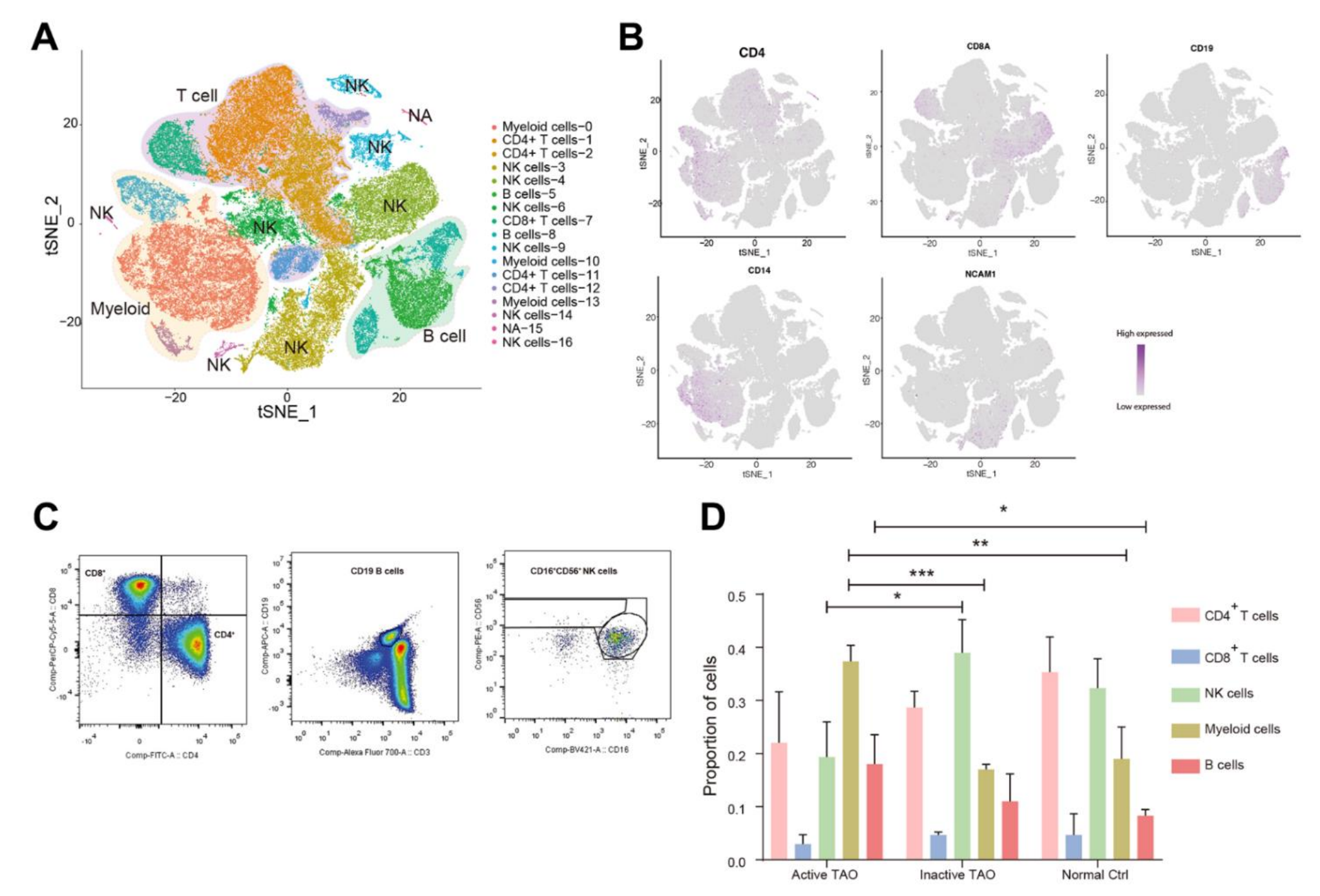 該研究使用10x Genomics Chromium平臺對總共9個樣本進行了scRNA-seq。經過初步質量控制后,總共獲得了93,007個PBMC用于后續(xù)分析,其中包括來自活性TAO的23,051個細胞、來自非活性TAO的34797個細胞和來自正常對照 (NC) 的35,159個細胞?;趫D的聚類分析確定了17個不同的聚類。在手動確認細胞類型注釋后,該研究成功將簇分為五種主要的PBMC細胞類型。其中包括各種CD4+ T細胞群 (CD4+)、NK (CD56+)、CD8+T細胞 (CD8A+)、B細胞 (CD19+) 和骨髓細胞 (CD11b+)(圖1A,1B)。通過流式細胞術分析驗證了scRNA-seq鑒定的這五種細胞類型的存在(圖1C)。值得注意的是,17個細胞簇中的12個 (70.6%) 包含來自多個單獨樣本的至少100個細胞,每個簇內平均有9個單獨樣本。