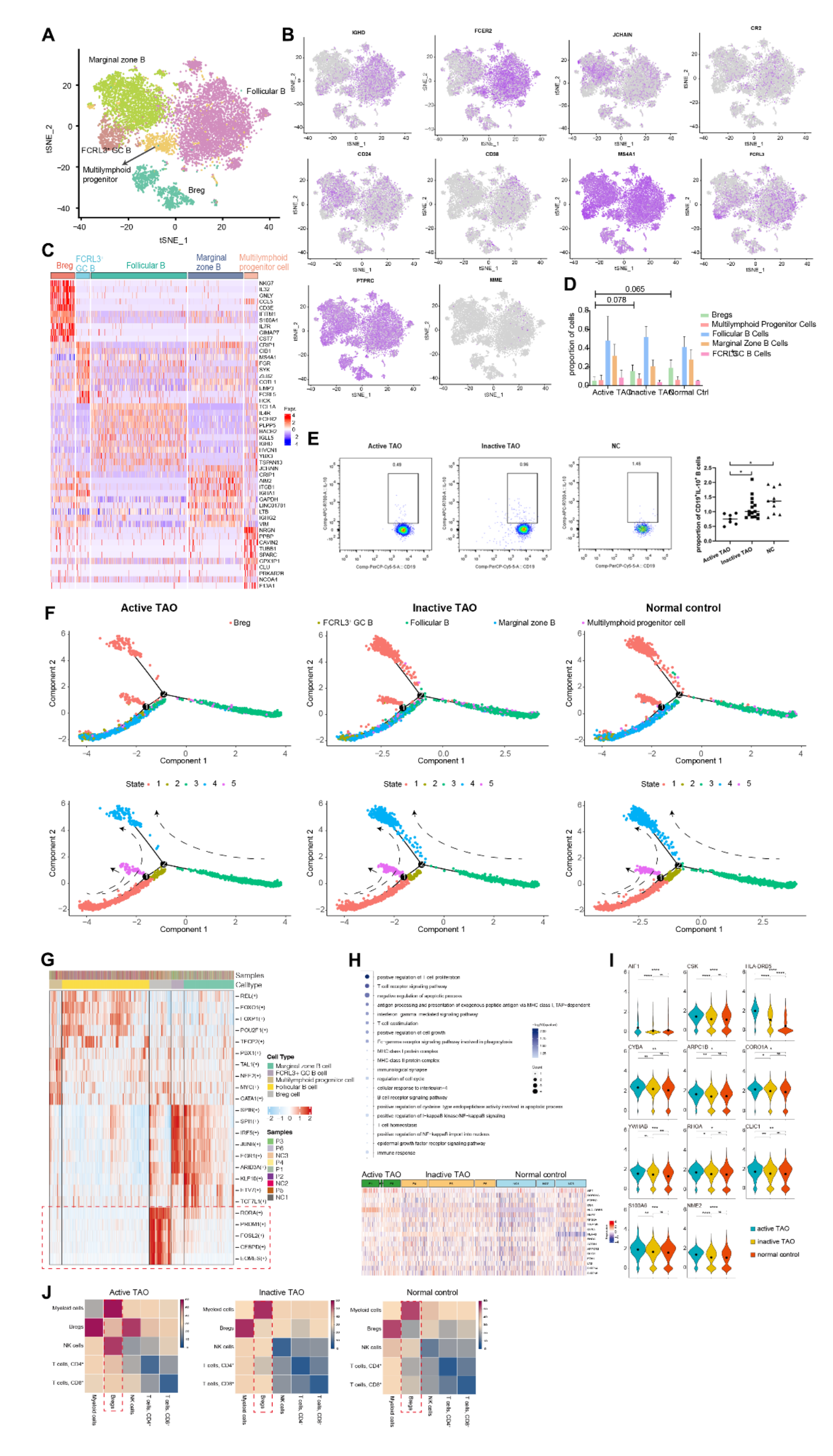 隨后檢查了疾病不同階段每個樣本中的B細胞組成。雖然三組的Bregs相對比例沒有顯著差異,但與非活動TAO組和正常對照組相比,活動TAO中的Bregs比例較低(p=0.078和p=0.065)(圖2D)。盡管觀察到的差異未達到統(tǒng)計顯著性,但這一結果表明了數據的潛在趨勢。為了驗證這些結果,該研究進行了流式細胞術分析,并使用CD19+IL-10+作為識別Bregs細胞群的標記。IL-10由于其抑制促炎癥反應的能力而被廣泛認為是Breg的標志。該分析證實,與非活動TAO和NC組相比,活動TAO中的Breg頻率降低(圖2E)。