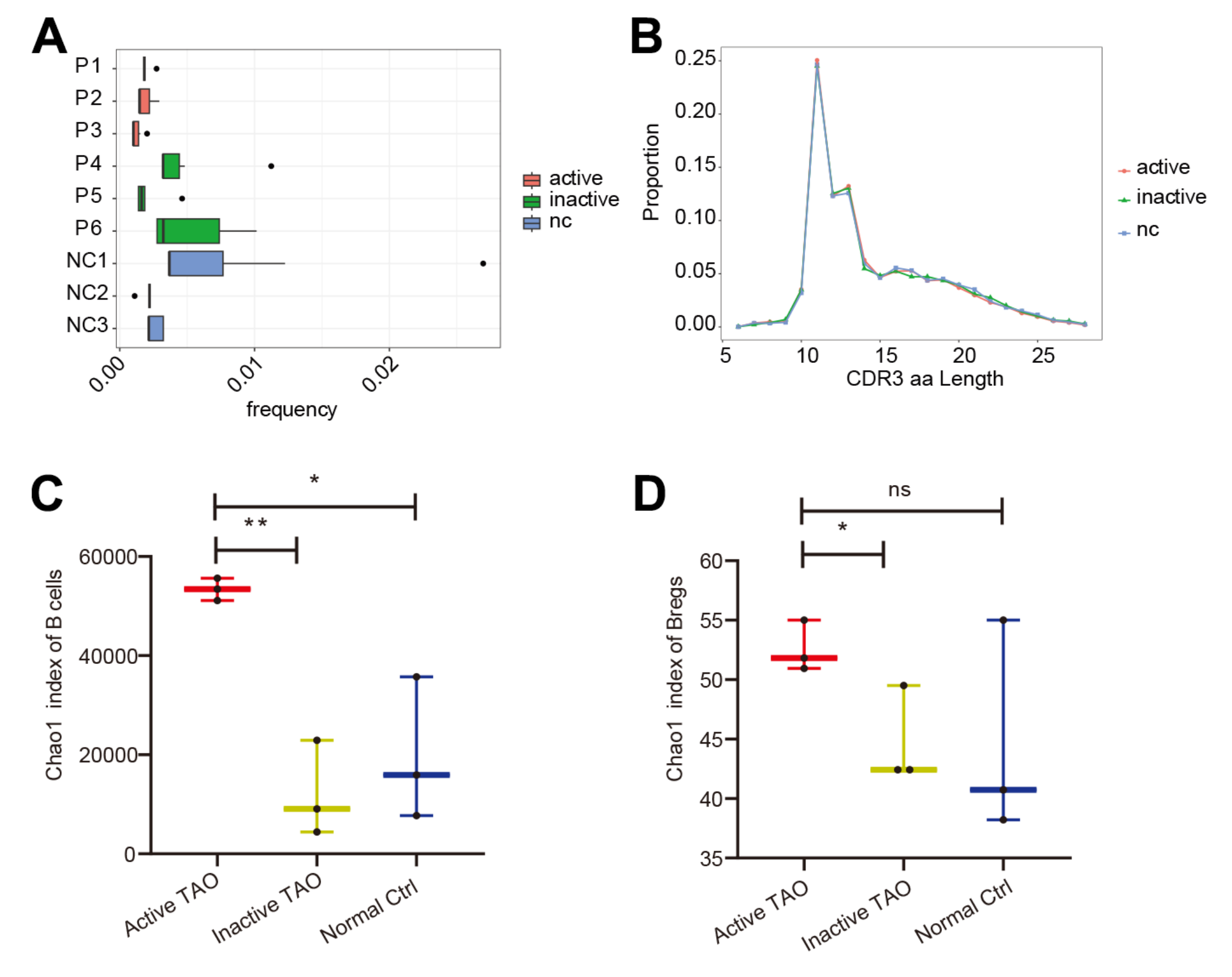 為了全面分析B細胞群中的基因表達和BCR多樣性,該研究對scRNA-seq分析中使用的PBMC樣本進行了scBCR-seq。在活性TAO中,前10個克隆型的比例(0.17%)與非活性組(0.37%,p=0.010)和NC組(0.41%,p=9.31E-05)(圖3A)。然而,對互補決定區(qū)3 (CDR3) 長度的分析沒有顯示任何明顯的變化(圖3B)。當檢查CDR3的多樣性時,通過Chao1指數量化,與NC組 (p=0.016) 和非活動TAO組 (p=0.002) (圖3C)。Breg細胞中也出現了類似的趨勢(圖 3D),與NC組相比顯著增加(p=0.011),但活性TAO之間沒有統(tǒng)計學顯著差異組和NC組 (p=0.213)。這些發(fā)現表明,雖然活性TAO中前10個克隆型的頻率降低,但在這種情況下CDR3序列的多樣性增加,這可能對免疫反應的調節(jié)有影響,并有助于活性TAO的發(fā)病機制。