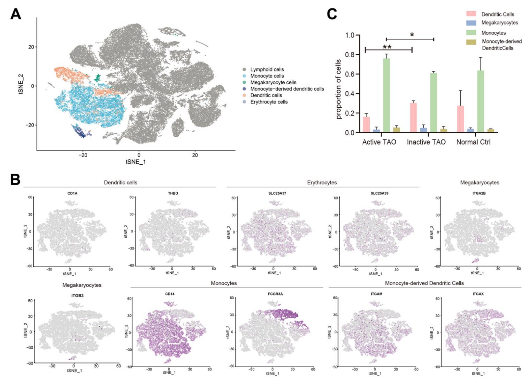 為了評估骨髓細胞在TAO中的參與情況,該研究鑒定了骨髓細胞的主要亞型,并檢查了它們在活性TAO中的配置。分析顯示了五種不同的骨髓細胞群,即單核細胞、巨核細胞、樹突狀細胞 (DC)、單核細胞衍生的DC和紅細胞(圖4A )。這些細胞類型的鑒定基于差異基因表達和對已建立的譜系標記的檢查(圖4B)?;钚訲AO 和非活性TAO之間的比較揭示了單核細胞和DC比例的顯著差異。與非活動TAO組相比,活動TAO患者的單核細胞比例顯著較高 (p=0.006),而活動TAO中DC的比例顯著較低 (p= 0.003) (圖4C)。這些發(fā)現表明,單核細胞水平增加和DC數量減少可能是TAO患者活動性疾病狀態(tài)的特征。