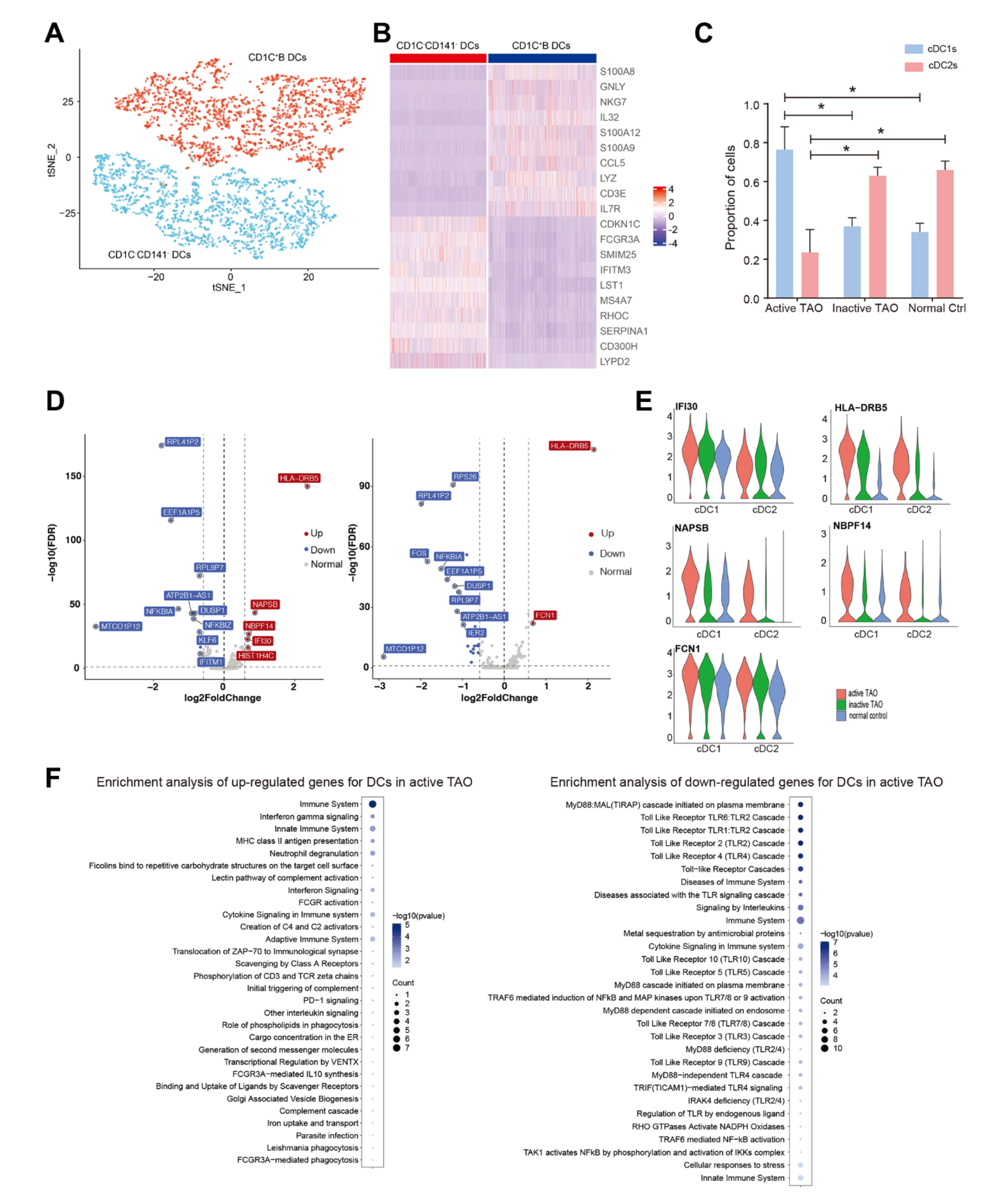 DC被細分為三個不同的子簇。Cluster 0被指定為cDC1s,其特征是高表達CDKN1C、FCGR3A、SMIM25、IFITM3、LST1MS4A7,以及CD1C CD141的低表達。簇1和簇2被鑒定為cDC2,其炎癥基因的表達水平升高,例如 CD14、S100A8、GNLY、NKG7 、IL32S100A12(圖5A、5B)。cDC1s的比例在活性TAO中顯著較高,而cDC2s在非活性TAO和NC中更為普遍(圖 5C)。鑒于cDC1和cDC2在免疫調節(jié)中發(fā)揮不同的作用- cDC1專門誘導Th2反應,而cDC2亞群表現出更強大的誘導Th1反應的能力[42],該研究進一步檢查了它們的基因表達譜。