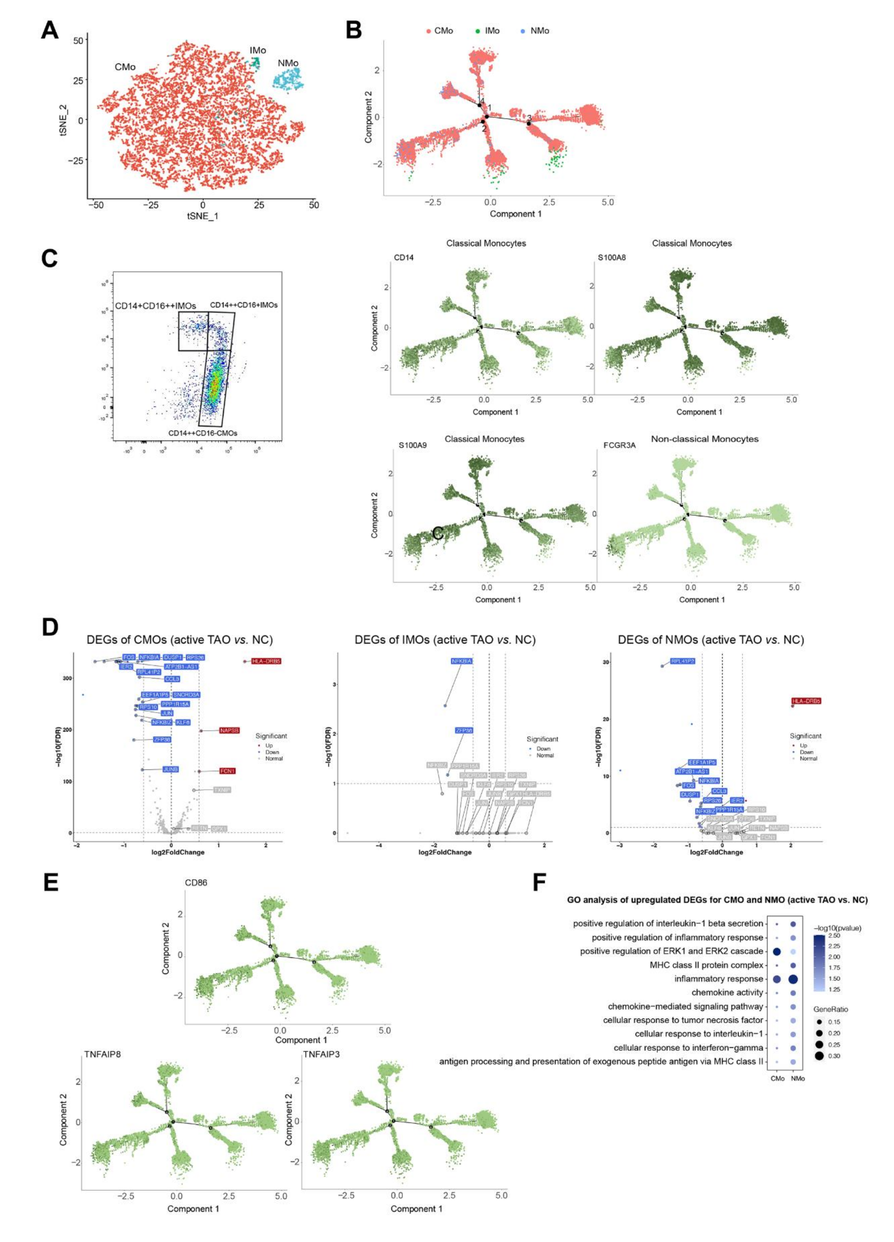作者的聚類分析成功地從總共 12,959 個單核細胞中識別出三個不同的亞群。第一個簇的特征是經典單核細胞 (CMO),其表現出高表達水平的CD14、S100A8 S100A9。第二個簇被鑒定為非經典單核細胞 (NMO),其特征是高表達FCGR3A(也稱為 CD16)。第三簇被識別為中間單核細胞 (IMO),CD14FCGR3A均高表達(圖6A、6B)。為了驗證這些單核細胞亞簇,進行了流式細胞術分析,確認 CMO為CD14++CD16-,NMO為CD14+CD16++,IMO為CD14++CD16+(圖6C)。軌跡推斷分析表明,單核細胞遵循從CMO開始并向NMO和IMO狀態(tài)分支的發(fā)育軌跡(圖6B)。這些對TAO期間單核細胞發(fā)育狀態(tài)變化的觀察表明它們在該疾病中的潛在作用。
