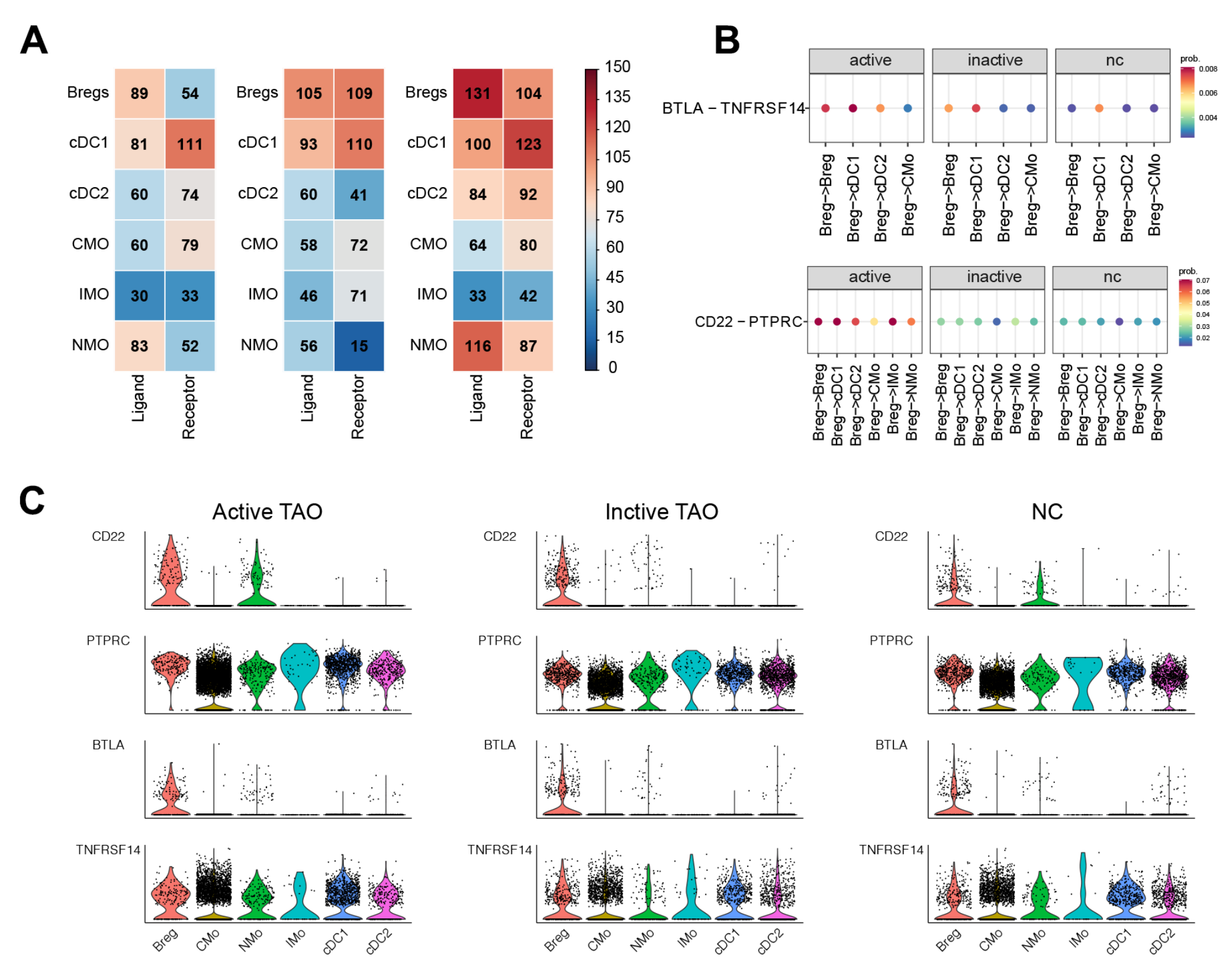 進一步檢查了活躍TAO背景下Breg、DC和單核細胞之間的細胞相互作用。該分析總共確定了1,352對重要的相互作用。值得注意的是,Bregs被發(fā)現表現出最多數量的配體,而cDC1亞簇則表現出最多數量的受體。值得注意的是,與非活性TAO 和正常對照組(NC)相比,Bregs在活性TAO中顯示出配體數量增加(圖7A)。