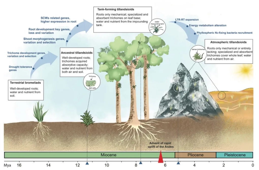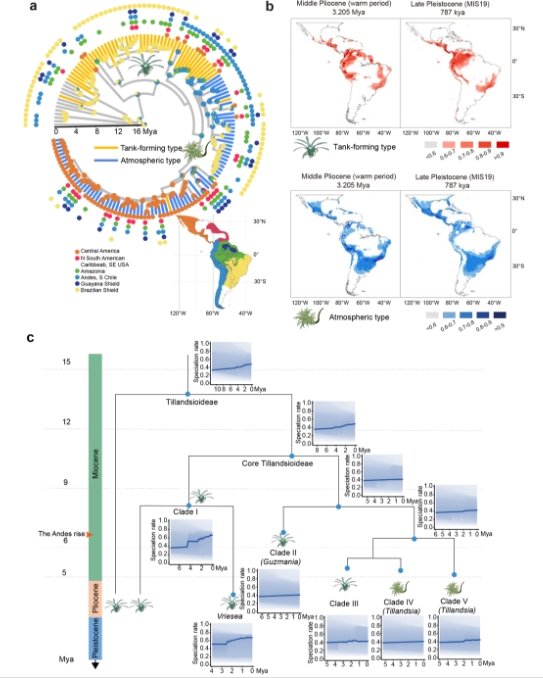 為了追溯空氣鳳梨的起源,研究人員廣泛收集了覆蓋空氣鳳梨亞科(Tillandsioideae)78%屬的植物,利用轉(zhuǎn)錄組測(cè)序獲得低拷貝基因的91個(gè)核基因,構(gòu)建了空氣鳳梨亞科植物系統(tǒng)發(fā)育樹(shù)(圖1)。然后通過(guò)祖先重建和分子鐘計(jì)算,發(fā)現(xiàn)核心空氣鳳梨亞科植物起源于11.3百萬(wàn)年前的安第斯山脈,祖先類(lèi)型為積水型鳳梨(圖2a)。大約在6百萬(wàn)年前,安第斯山脈快速隆起,推動(dòng)了物種的分化,完全大氣生的空氣鳳梨出現(xiàn),這些植物通常被稱(chēng)為“air plants”。地球氣候世代的轉(zhuǎn)變也加速了物種的分化(圖2b-c)。