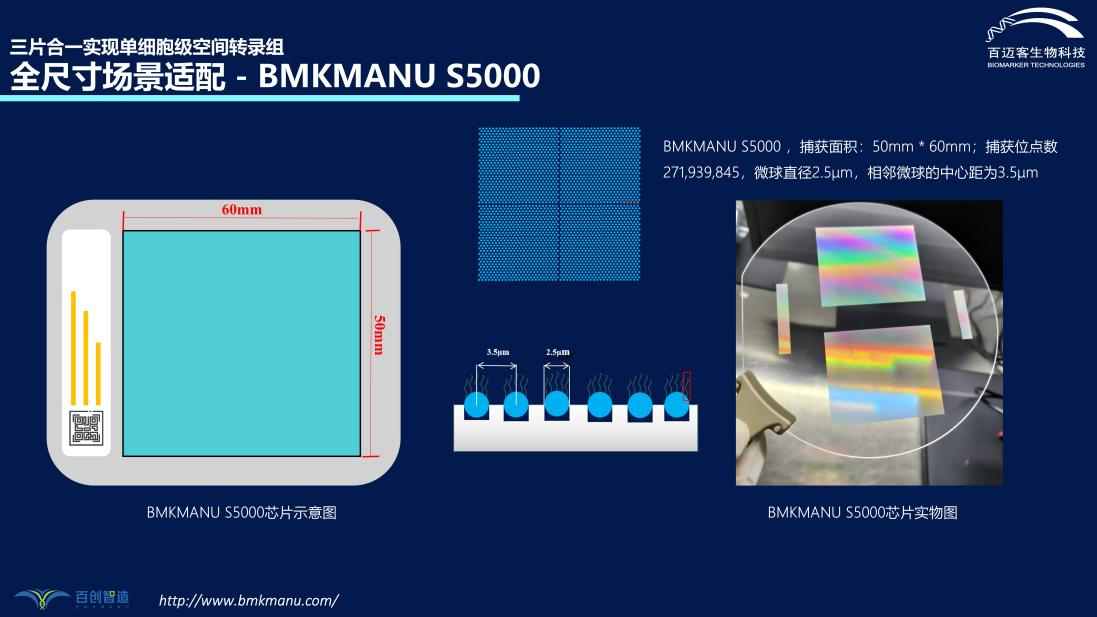 隨著百邁客生物在時(shí)空組學(xué)領(lǐng)域的不斷探索,在保證具備亞細(xì)胞分辨率的條件下,研究團(tuán)隊(duì)已成功完成了全尺寸場(chǎng)景適配捕獲芯片BMKMANU S5000的研發(fā)與測(cè)試。捕獲面積:50mm*60mm;捕獲位點(diǎn)數(shù):271,939,845;微球直徑:2.5μm;相鄰微球的中心距為3.5μm。該產(chǎn)品的推出大大降低了空間轉(zhuǎn)錄組實(shí)驗(yàn)對(duì)樣本尺寸的限制,將更大程度地滿(mǎn)足當(dāng)前科研需求。