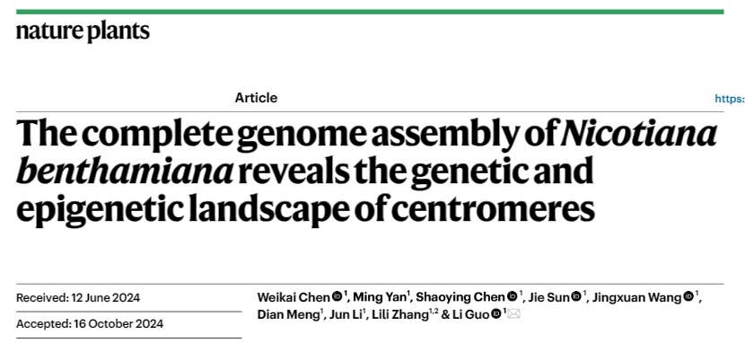 2024年11月14日,北京大學(xué)現(xiàn)代農(nóng)業(yè)研究院郭立研究員團(tuán)隊(duì)的本氏煙草完整基因組研究成果以“The complete genome assembly of?Nicotiana benthamiana?reveals the genetic and epigenetic landscape of centromeres”為題,在國(guó)際著名期刊Nature Plants上在線發(fā)表。