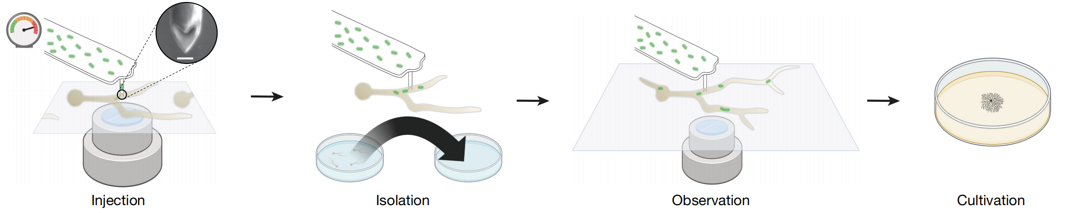 使用 FluidFM 技術(shù),在不破壞真菌小孢根霉(R. microsporus)細(xì)胞的情況下將細(xì)菌植入其中,通過該技術(shù),單次注射可將1-30個(gè)細(xì)菌注入R. microsporus內(nèi),同時(shí)可通過實(shí)時(shí)成像觀察人工誘導(dǎo)的內(nèi)共生現(xiàn)象的命運(yùn)。用GFP標(biāo)記的M. rhizoxinica注射入EH型絲狀真菌,細(xì)菌成功在絲狀真菌內(nèi)定殖并能垂直傳遞(遺傳),表明通過注射方法可以重建自然內(nèi)共生。