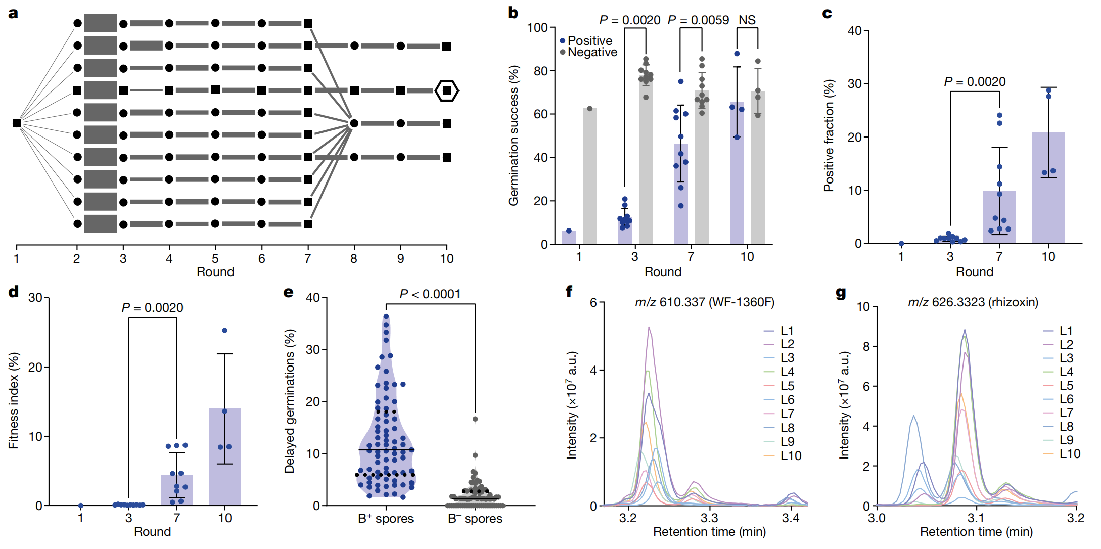 為進(jìn)一步提高人工誘導(dǎo)的NH-根霉生菌內(nèi)共生體系的遺傳穩(wěn)定性,進(jìn)行多輪生長和篩選,以施加正向選擇壓力。隨著進(jìn)化過程的進(jìn)行,攜帶細(xì)菌的孢子的萌發(fā)率逐漸提高,并且攜帶細(xì)菌的孢子的比例也顯著增加,而真菌也在適應(yīng)性進(jìn)化過程中發(fā)生了基因突變,這些突變可能與內(nèi)吞作用有關(guān),這與共生關(guān)系的穩(wěn)定性和適應(yīng)性的提高相一致。需要注意的是,由于真菌基因組研究不足,且存在潛在的表觀遺傳效應(yīng),這些推測仍需進(jìn)一步驗(yàn)證。在適應(yīng)性進(jìn)化后的共生關(guān)系中,M. rhizoxinica?能在新的宿主菌株 NH 中能夠產(chǎn)生次級(jí)代謝產(chǎn)物 WF-1360F,而根霉菌株 NH 能夠?qū)?WF-1360F 轉(zhuǎn)化為 rhizoxin。這表明,通過誘導(dǎo)內(nèi)共生可以將新的代謝功能轉(zhuǎn)移到宿主中。