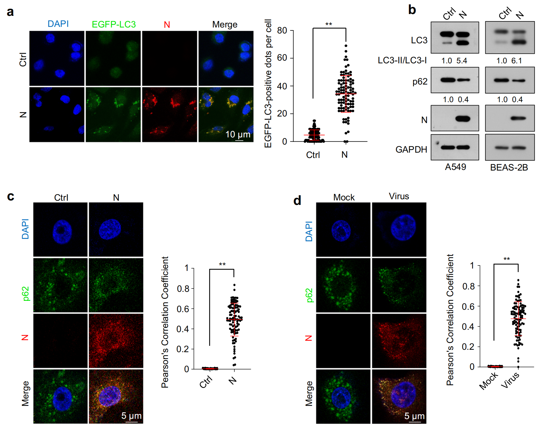 在 BioGRID 數(shù)據(jù)庫中找到了一種自噬受體蛋白SQSTM1/p62 ,共聚焦顯微鏡分析和免疫共沉淀分析分別證實了 N 蛋白和 p62 之間的相互作用及其共定位,p62 敲低部分緩解了 N 蛋白誘導的?Dicer、XPO5、SRSF3?和?hnRNPA3?蛋白的下調(diào);然而,它不會影響不表達 N 蛋白的細胞中的?Dicer、XPO5、SRSF3?或?hnRNPA3?蛋白水平,表明?p62 通過與 N 蛋白的相互作用將 N 蛋白相互作用蛋白(包括?Dicer、XPO5、SRSF3?和?hnRNPA3募集到吞噬細胞中,導致自噬降解。