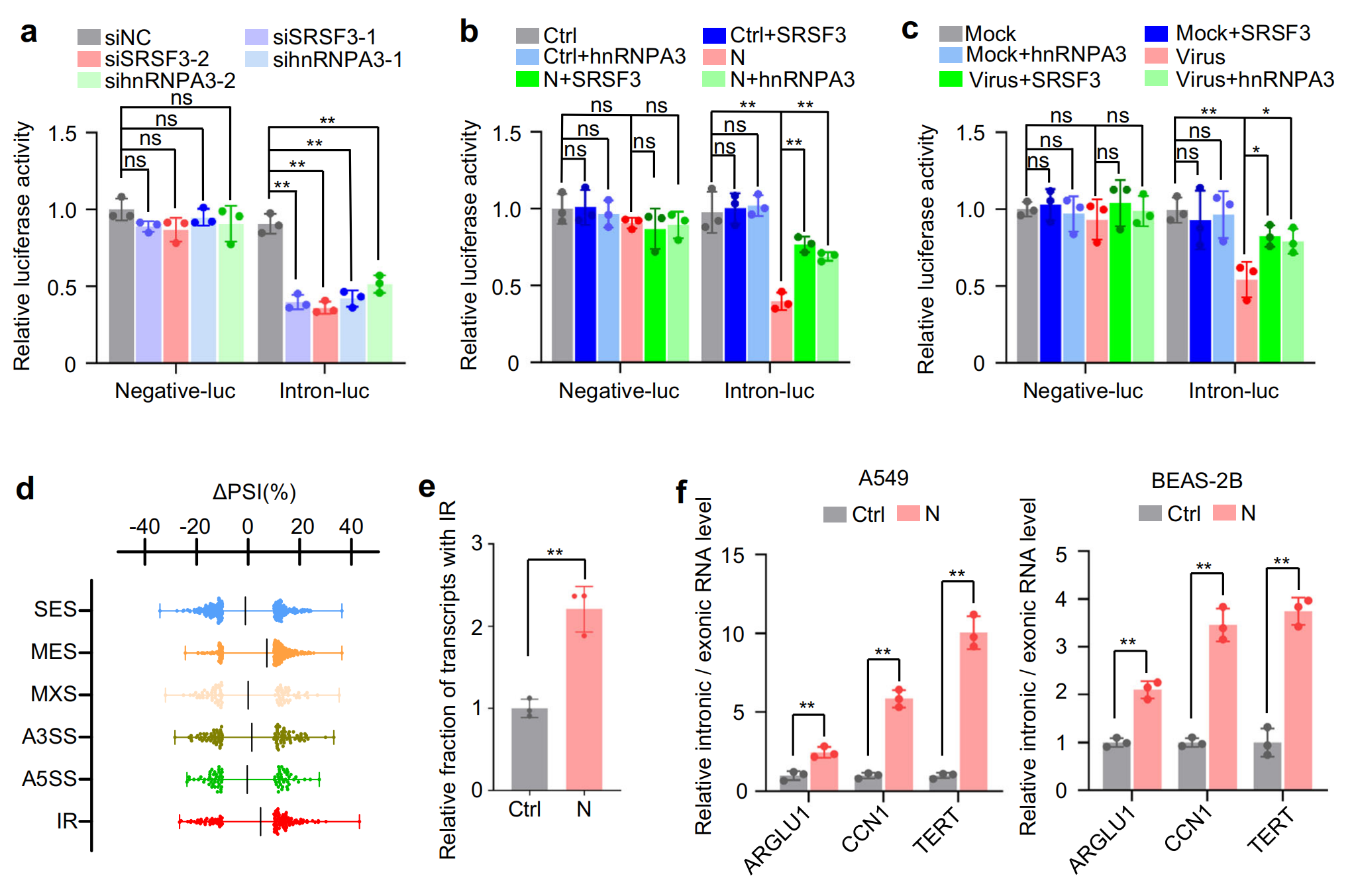 SRSF3hnRNPA3敲除抑制了含有內(nèi)含子的報告基因小基因的剪接,證實了它們確實是剪接因子,而它們的過表達部分緩解了 N 蛋白或 SARS-CoV-2 感染對 RNA 剪接的抑制作用,進一步進行全長轉(zhuǎn)錄組測序,通過可變剪接分析發(fā)現(xiàn),N 蛋白誘導內(nèi)含子保留。此外,RT-qPCR證實,異位 N 蛋白表達或 SARS-CoV-2 感染降低了一組內(nèi)源性內(nèi)含子的剪接效率,SRSF3?和?hnRNPA3?過表達部分減輕了 N 蛋白和 SARS-CoV-2 對 RNA 剪接的抑制作用,這些結(jié)果表明,N 蛋白通過降低?SRSF3?和?hnRNPA3?的表達來抑制 RNA 剪接。