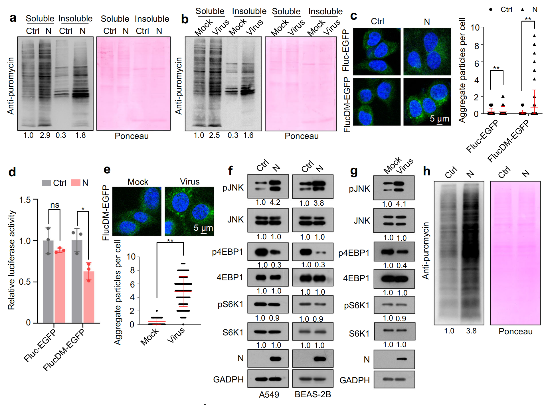 剪接抑制會誘導廣泛的 IR 和隨后的內(nèi)含子保留 mRNA 的翻譯,一部分內(nèi)含子衍生的多肽容易縮合且具有蛋白毒性,用嘌呤霉素對新生多肽進行代謝標記,結(jié)果顯示異位 N 蛋白表達或 SARS-CoV-2 感染誘導不溶性蛋白合成增加,而N蛋白與RNA的結(jié)合主要在可溶性蛋白部分被檢測到,免疫熒光檢測結(jié)果表明,N 蛋白和 SARS-CoV-2 感染誘導了 EGFP 聚集體的產(chǎn)生,誘導蛋白毒性應激。