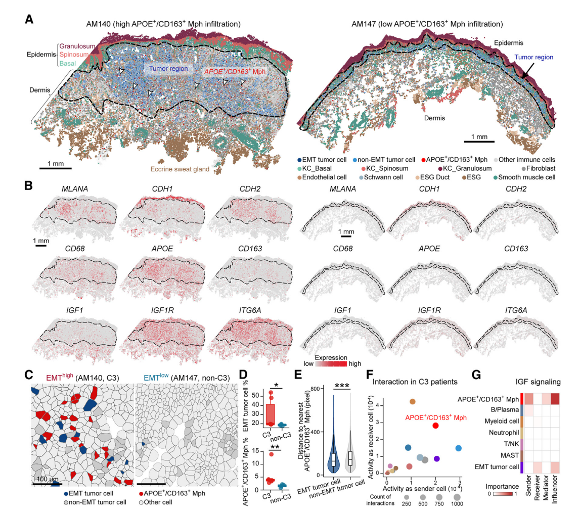 數(shù)據(jù)表明(與單細胞數(shù)據(jù)聯(lián)合分析)C3 亞型的 EMT 腫瘤細胞占比高,并且有 APOE+CD163+ 巨噬細胞的浸潤,巨噬細胞與 EMT 腫瘤細胞具有共定位特征。CellChat 互作分析驗證了 APOE+CD163+ 巨噬細胞的高度受體配體互作,與單細胞轉(zhuǎn)錄組結(jié)果高度一致(APOE+/CD163+ 巨噬細胞是空間中 IGF 通路網(wǎng)絡的發(fā)送者(sender)和影響者(Influencer))。使用空間單細胞蛋白組學對患者腫瘤免疫微環(huán)境進行了深入分析,結(jié)果顯示APOE+CD163+ TAM和EMThigh腫瘤細胞存在高度相關的定位,這與空間轉(zhuǎn)錄組的結(jié)果一致。