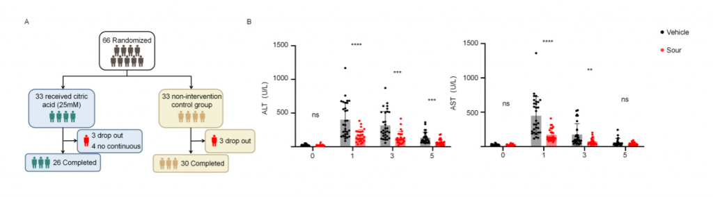 為了確認(rèn)酸刺激在人類肝IRI中的作用,研究者進(jìn)行了開(kāi)放、隨機(jī)、空白對(duì)照臨床試驗(yàn)(ChiCTR2400088096),包含多種良性/惡性肝腫瘤、肝外傷、膿腫、囊腫和包蟲病,由于手術(shù)期間門靜脈短暫阻斷以減少肝切除過(guò)程中出血,導(dǎo)致肝出現(xiàn)缺血再灌注損傷。干預(yù)組33名患者,術(shù)前24h開(kāi)始,每8h給與新鮮的25mM檸檬酸(持續(xù)5min),對(duì)照組33名患者不接受酸刺激,剔除6名術(shù)中肝缺血超過(guò)30min患者以及4名依從性差患者,肝切除術(shù)后第1/3/5天對(duì)患者肝功能進(jìn)行評(píng)估,結(jié)果顯示酸刺激組血清ALT和AST水平顯著低于對(duì)照組,高ALT水平(>500 U/L)患者數(shù)量也顯著更低,這些結(jié)果表明酸刺激可減輕人類肝切除術(shù)引起的肝IRI。