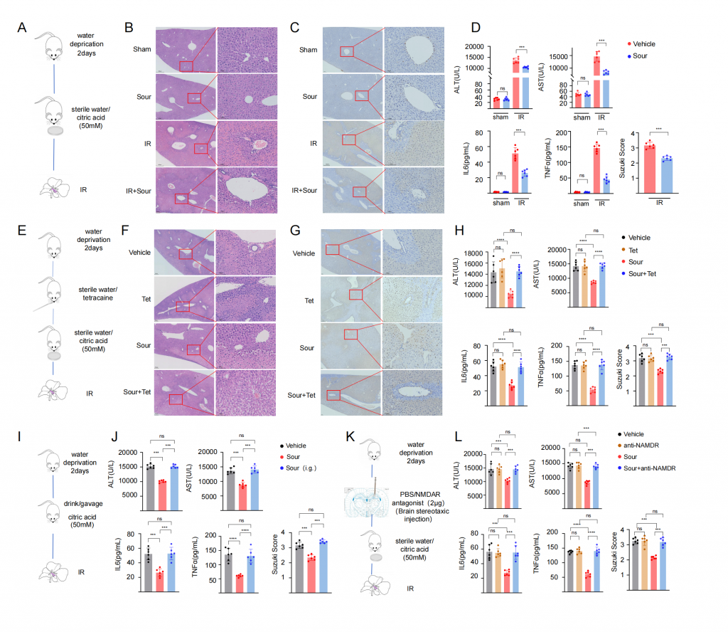 研究者首先構(gòu)建酸刺激下肝臟缺血再灌注損傷(IRI)小鼠模型,發(fā)現(xiàn)酸刺激可以減少肝組織損傷以及血清標(biāo)志物水平。但是,使用丁卡因局麻小鼠舌頭或者灌胃檸檬酸不能減少肝損傷和血清標(biāo)志物水平;NMDAR阻斷劑1(阻斷NMDAR介導(dǎo)的興奮性突觸傳遞)立體定位注射到腹后內(nèi)側(cè)核(VPN)后,酸刺激后IRI肝的血清標(biāo)志物水平和肝損傷程度無(wú)明顯變化,表明神經(jīng)系統(tǒng)在酸刺激減輕IRI過(guò)程中起重要作用。此外,小鼠VPN注射示蹤病毒的實(shí)驗(yàn)結(jié)果顯示,肝臟以及CG(腹腔神經(jīng)節(jié))均檢測(cè)到熒光,行腹腔神經(jīng)節(jié)切除術(shù)能降低IRI肝的組織損傷和血清標(biāo)志物水平,表明酸刺激減輕肝損傷過(guò)程通過(guò)腦-CG-肝軸。