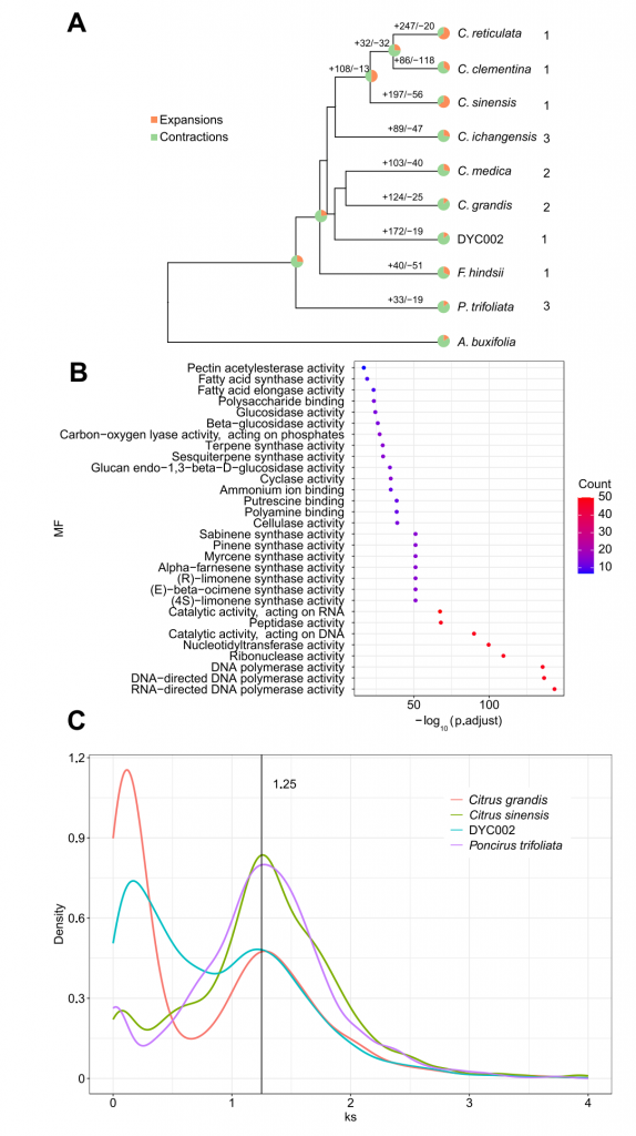 高質(zhì)量基因組的發(fā)表對了解柑橘發(fā)揮重要作用。然而,由于其復雜的遺傳背景,許多柑橘物種的起源和進化仍不清楚。作者從頭組裝了DYC002的294mbp染色體水平的基因組,對兩個單倍型基因組比較,發(fā)現(xiàn)了1.2%的基因組內(nèi)變異,包括175 萬個SNPs,149,471個插入和154,215個缺失。以該基因組為參考,對378份具有代表性的柑橘材料進行了重測序和系統(tǒng)發(fā)育分析,作者研究柑橘屬可分為兩個進化支,證實了柑橘核心種的主要起源中心是華南地區(qū),特別是喜馬拉雅-橫斷山脈。該研究為了解柑橘品種的起源和進化提供了新的視角,并可能為柑橘育種和改良提供有價值的基因組資源。