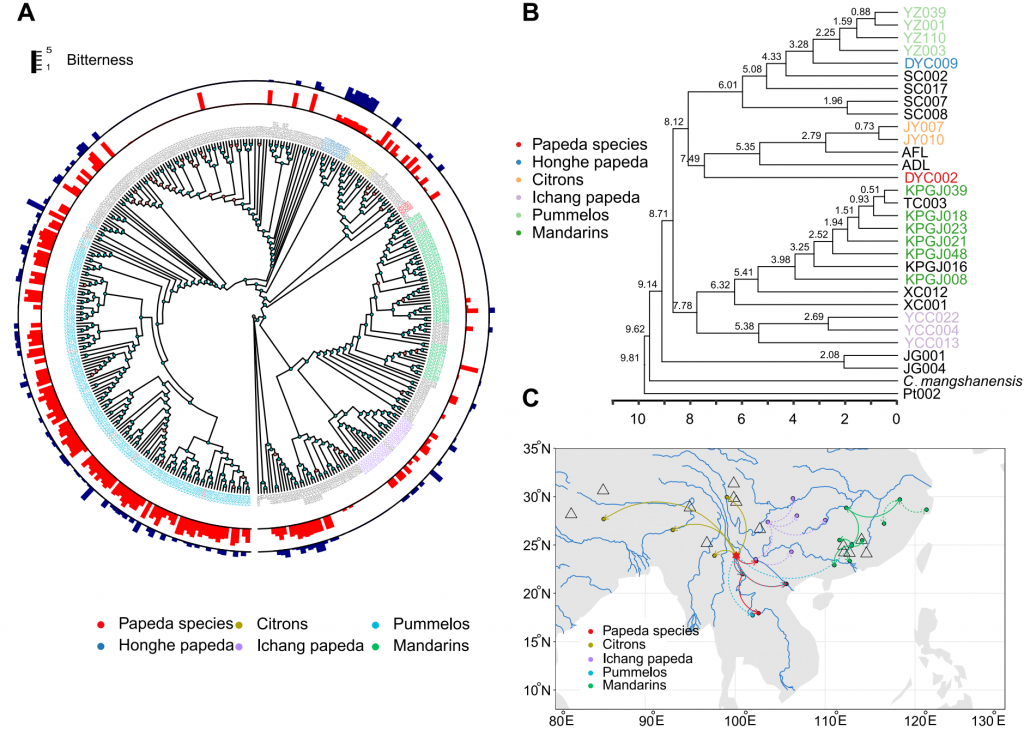 柑橘是世界上種植最廣泛的水果之一,目前在140多個國家和地區(qū)種植。雖然過去的二十年里柑橘植物的種群結構和遺傳多樣性已被調(diào)查,但由于其豐富的資源類型和雜交頻繁,許多柑橘物種的起源和進化仍不清楚。野生柑橘物種和原始柑橘保存了豐富的遺傳資源和遺傳多樣性,可用于闡明柑橘物種的起源和進化。2015年,在西雙版納發(fā)現(xiàn)一棵200多年的野生柑橘樹大翼葉柑橘(DYC002),被認為是研究柑橘進化及苦味馴化的很好材料。