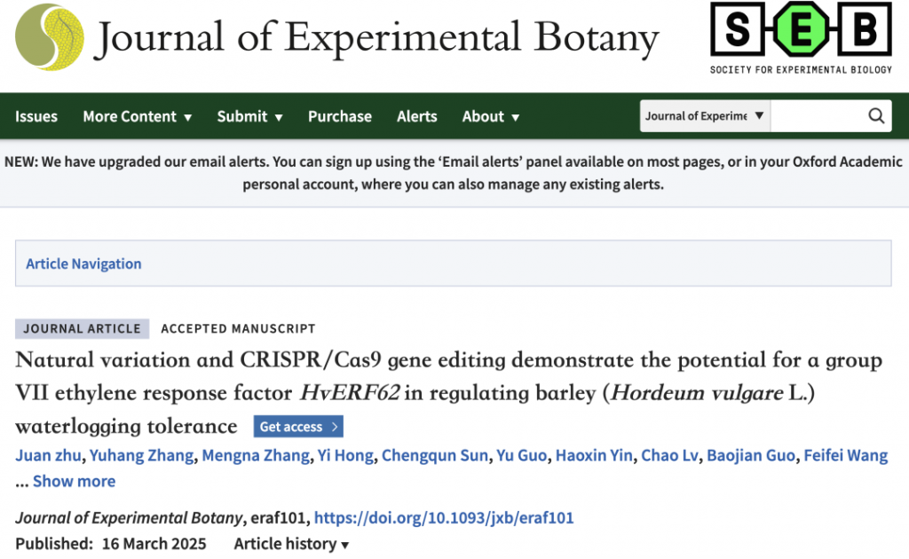 揚(yáng)州大學(xué)Rugen Xu團(tuán)隊(duì)在《Journal of Experimental Botany》雜志發(fā)表題為“Natural variation and CRISPR/Cas9 gene editing demonstrate the potential for a group VII ethylene response factor HvERF62 in regulating barley (Hordeum vulgare L.) waterlogging tolerance”的論文,揭示了大麥VII類乙烯反應(yīng)因子?HvERF62?通過調(diào)控氣孔形成、活性氧穩(wěn)態(tài)和碳水化合物積累,從而提高大麥耐漬澇能力。