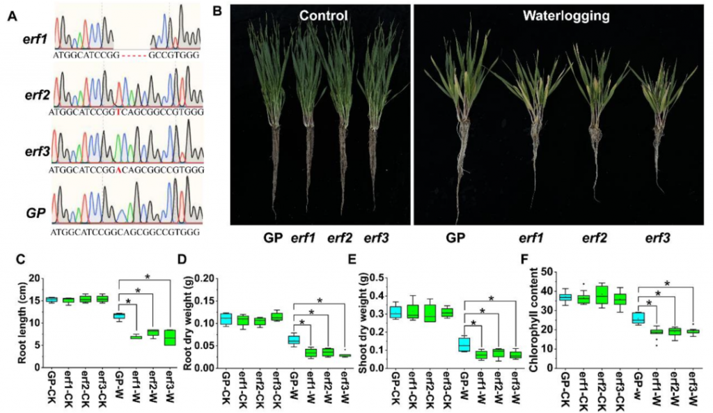 利用CRISPR/Cas9基因編輯技術(shù),獲得了3個(gè)獨(dú)立的 HvERF62 純合突變體(erf1、erf2、erf3)。這些突變體在正常條件下與野生型(GP)的生長發(fā)育沒有顯著差異。然而,在漬澇脅迫下,突變體的不定根數(shù)量顯著少于野生型,且根長、地上部干重、根干重和葉綠素含量均顯著低于野生型(圖4B-4F)。