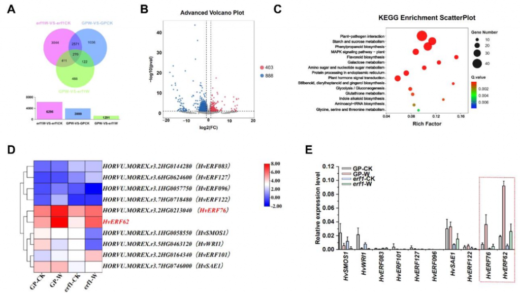 對(duì)野生型和 HvERF62 突變體進(jìn)行轉(zhuǎn)錄組測序分析。結(jié)果顯示,在漬澇脅迫下,突變體中有403個(gè)基因上調(diào)表達(dá),888個(gè)基因下調(diào)表達(dá)(圖5A, 5B)。KEGG富集分析表明,這些差異表達(dá)基因顯著富集在植物-病原互作、淀粉和蔗糖代謝、苯丙烷類生物合成、MAPK信號(hào)通路、植物激素信號(hào)轉(zhuǎn)導(dǎo)、糖酵解/糖異生等通路中(圖5C)。