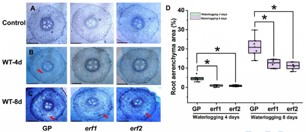 進(jìn)一步分析發(fā)現(xiàn),在漬澇脅迫4天后,野生型的不定根中形成了氣孔,而突變體中沒有形成(圖6B, 6D)。同時(shí),突變體中ADH和PDC活性顯著高于野生型(圖7I, 7J),表明突變體更早進(jìn)入無氧呼吸狀態(tài)。在漬澇脅迫8天后,野生型和突變體都形成了氣孔,但野生型中的氣孔比例更高(圖6C, 6D)。此外,野生型積累了更多的碳水化合物(蔗糖、葡萄糖和淀粉),而突變體中的碳水化合物含量顯著較低(圖7F-7H)。