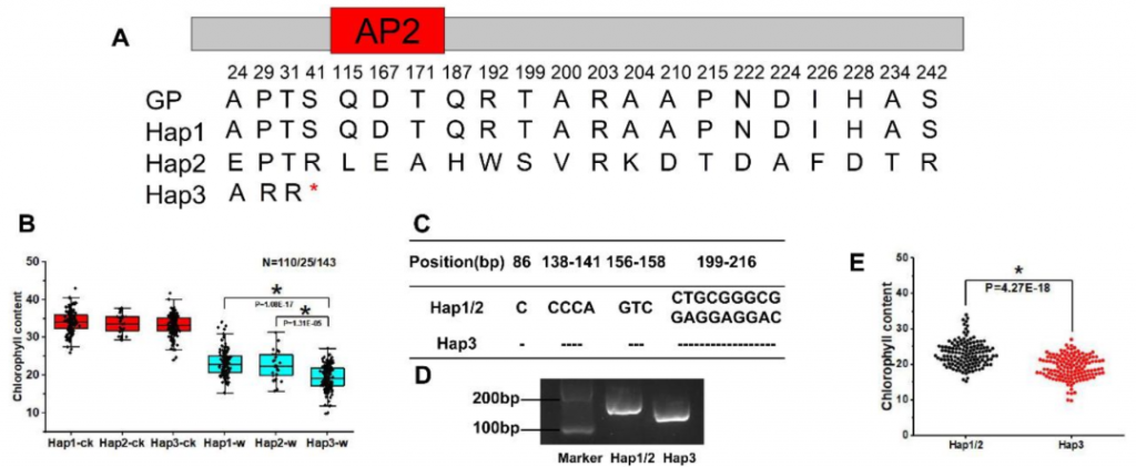 對(duì)自然群體中 HvERF62 基因的序列進(jìn)行分析,發(fā)現(xiàn)存在43個(gè)SNPs和4個(gè)InDels。根據(jù)這些變異,將種質(zhì)資源分為3個(gè)單倍型(Hap1、Hap2和Hap3)。其中,Hap3由于序列變異導(dǎo)致編碼提前終止。在漬澇脅迫下,Hap1和Hap2的葉綠素含量顯著高于Hap3(圖10A, 10B)。基于InDel變異設(shè)計(jì)的分子標(biāo)記可用于區(qū)分不同單倍型(圖10C-10E)。