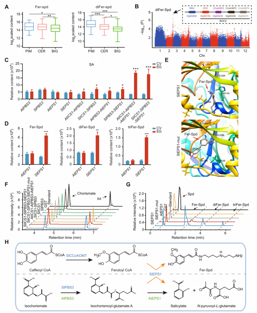 該研究對(duì)401份番茄群體材料的酚胺物質(zhì)進(jìn)行了檢測(cè),通過(guò)基于代謝物全基因組關(guān)聯(lián)分析(GWAS)鑒定出2號(hào)染色體上與酚胺合成基因簇(BGC2)。實(shí)驗(yàn)證明基因簇中核心組分SlEPS1參與水楊酸和酚胺的生物合成,其關(guān)鍵氨基酸殘基 His169對(duì)酚胺合成至關(guān)重要,且SlEPS1的雙酶活性與增強(qiáng)的抗病性相關(guān)(圖1)