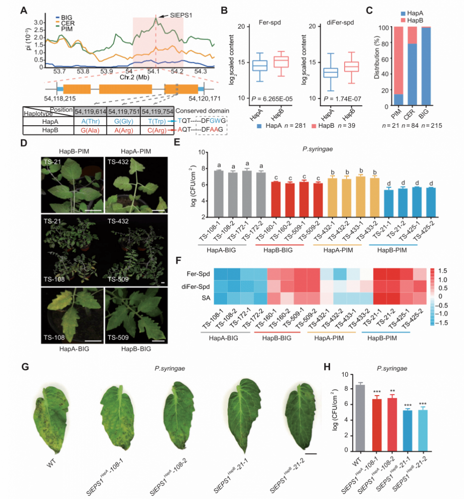 通過(guò)比較不同番茄亞群中SlEPS1位點(diǎn)的核苷酸多樣性,發(fā)現(xiàn)該基因可能受人工選擇影響。變異組分析發(fā)現(xiàn)番茄群體間有兩個(gè)不同的SlEPS1單倍型組合:SlEPS1HapA和SlEPS1HapB,其中SlEPS1HapB的植株中酚胺和SA水平更高,抗病性更強(qiáng)。這些結(jié)果表明,在番茄的馴化選擇過(guò)程中,SlEPS1HapB的消失可能是導(dǎo)致番茄抗病性降低的原因之一(圖2)。