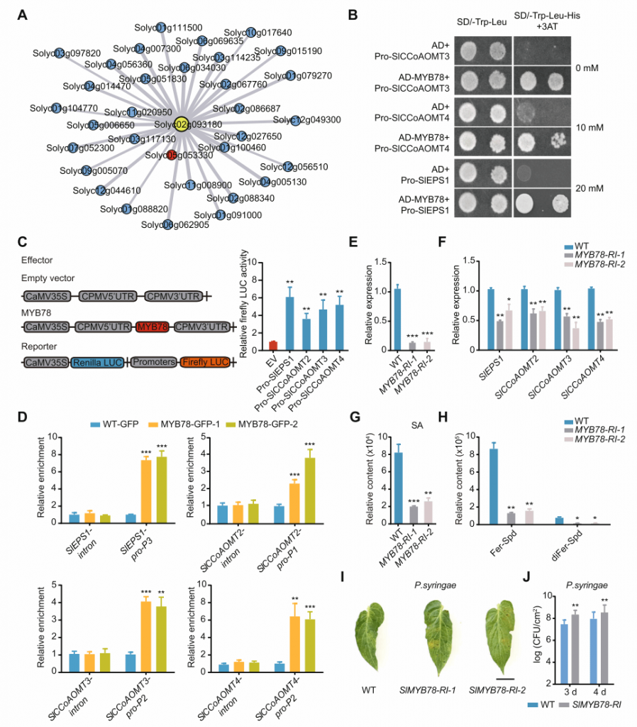 此外,研究還發(fā)現(xiàn)了一個(gè)與BGC2顯著共表達(dá)的轉(zhuǎn)錄因子SlMYB78。它能夠直接結(jié)合并激活BGC2基因簇的啟動(dòng)子,從而調(diào)控BGC2基因簇的表達(dá)。當(dāng)SlMYB78基因被沉默時(shí),酚胺和水楊酸的含量顯著下降,導(dǎo)致其抗病能力降低(圖3)。