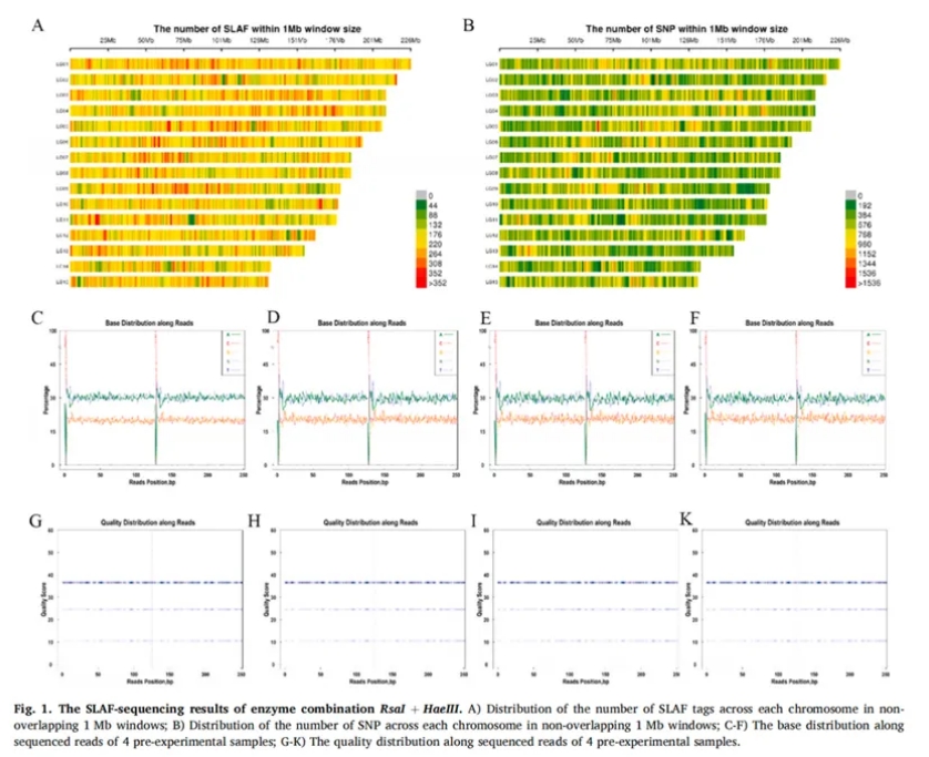 首先,研究共采集25個(gè)油茶栽培品種,共100個(gè)樣本,利用高通量SLAF-seq建庫(kù)策略進(jìn)行數(shù)據(jù)獲取。在建庫(kù)酶切方案篩選方面,團(tuán)隊(duì)預(yù)先開(kāi)展酶切模擬試驗(yàn)比較篩選最優(yōu)組合,F(xiàn)igure 1 顯示,RsaI + HaeIII組合在標(biāo)簽分布均勻性、多態(tài)性與文庫(kù)復(fù)雜度上表現(xiàn)最佳。共獲得362,152個(gè)高質(zhì)量SLAF 標(biāo)簽,其中254,357個(gè)為多態(tài)性標(biāo)簽,平均GC含量41.30%,平均Q30高達(dá)93.44%,顯示測(cè)序數(shù)據(jù)具備極高的可靠性。RsaI + HaeIII雙酶切組合可實(shí)現(xiàn)高效的特異性位點(diǎn)擴(kuò)增與標(biāo)簽標(biāo)準(zhǔn)化,為后續(xù)大規(guī)模SNP檢測(cè)奠定了數(shù)據(jù)基礎(chǔ)。