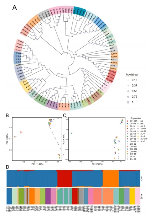 2025年4月2日,Industrial Crops & Products在線發(fā)表了由四川省林草局、四川大學(xué)生命科學(xué)學(xué)院王婧教授課題組聯(lián)合中南林業(yè)科技大學(xué)等多家單位合作完成的研究論文,題為” Phylogenomic analysis and SNP fingerprinting construction of Camellia oleifera Abel. germplasm resources using SLAF-seq technology”。該研究利用SLAF-seq技術(shù),對(duì)四川省主栽的來(lái)自我國(guó)南方25個(gè)主要油茶品種開(kāi)展了系統(tǒng)發(fā)育和群體基因組學(xué)研究,并篩選關(guān)鍵SNP標(biāo)記構(gòu)建了DNA指紋圖譜。該指紋圖譜的構(gòu)建有望為我國(guó)南方尤其是四川地區(qū)油茶種質(zhì)資源保護(hù)、開(kāi)發(fā)利用及品種選育提供關(guān)鍵科學(xué)依據(jù)。