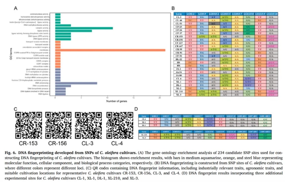 為建立油茶品種的快速鑒定體系,研究人員進(jìn)一步構(gòu)建了25個(gè)主栽油茶品種的DNA指紋圖譜(Figure 6)。在初步獲得的234個(gè)候選SNP中,有196個(gè)位點(diǎn)被注釋為功能明確的編碼區(qū)域突變,富集于DNA連接、RNA加工、果糖代謝等重要通路(Figure 6A)。為提升區(qū)分效率,進(jìn)一步篩除掉存在多變異干擾或功能不明的位點(diǎn),最終篩選得到15個(gè)核心SNP位點(diǎn),可有效區(qū)分全部25個(gè)油茶品種,實(shí)現(xiàn)穩(wěn)定的遺傳身份標(biāo)識(shí)。為確保指紋圖譜的準(zhǔn)確性與應(yīng)用價(jià)值,研究通過(guò)Sanger測(cè)序?qū)?5個(gè)候選SNP位點(diǎn)進(jìn)行了引物驗(yàn)證,最終篩選出8個(gè)多態(tài)性強(qiáng)、峰型清晰的核心SNP位點(diǎn)用于構(gòu)建指紋圖譜(Figure 6B)。這些位點(diǎn)主要分布于功能基因區(qū),涉及次生代謝、胚胎發(fā)育、自噬調(diào)控等關(guān)鍵生物過(guò)程,如編碼α-萜品醇合酶的LG12_G02320和控制胚胎發(fā)育與芽形成的FLA8蛋白基因LG03_G02445等,展現(xiàn)出良好的應(yīng)用潛力。為進(jìn)一步提升指紋信息的實(shí)用性,研究人員還開(kāi)發(fā)了包含8個(gè)位點(diǎn)基因型信息的二維碼系統(tǒng),其中涵蓋了油脂品質(zhì)、農(nóng)藝性狀及適宜種植區(qū)域等數(shù)據(jù),為油茶品種的數(shù)字化管理與選育決策提供便捷、高效的技術(shù)支持(Figure 6C)。二維碼系統(tǒng)為油茶品種的數(shù)字化管理與選育決策提供了便捷、高效的技術(shù)支持。通過(guò)將分子標(biāo)記信息與油茶生產(chǎn)應(yīng)用相結(jié)合,研究成果不僅實(shí)現(xiàn)了分類識(shí)別功能,還為分子育種提供了重要參考價(jià)值。
