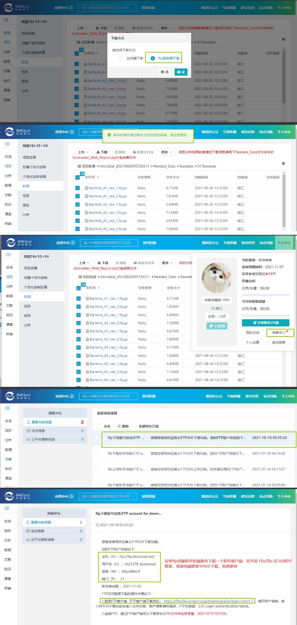 FTP 下載指導(dǎo):下載方式選擇 FTP 下載,平臺(tái)會(huì)將具體的操作步驟發(fā)到注冊郵箱賬號(hào)中,也會(huì)發(fā)到個(gè)人中心信息中,如下: