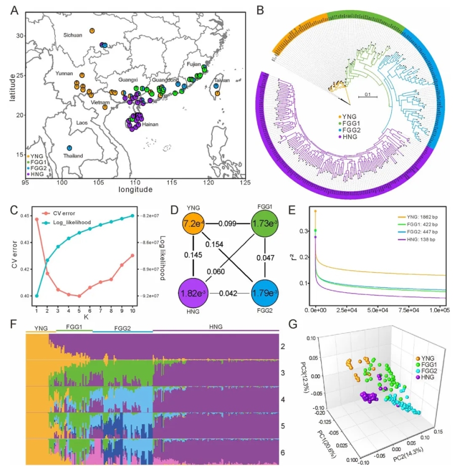 隨后,分析了群體結構,在基因組水平上揭示了群體之間的遺傳變異水平和親緣關系,分析表明該群體內存在四個主要亞群:YNG(云南亞群,來自云南野生、廣西大興的種質)、HNG(海南亞群,來自海南和廣地博白的種質)、FGG1, 和FGG2亞群(包含來自福建和部分廣東、廣西的種質)。YNG的核苷酸多樣性低于HNG、FGG1和FGG2的,LD遺傳距離的大于其他三個亞群(圖1)。