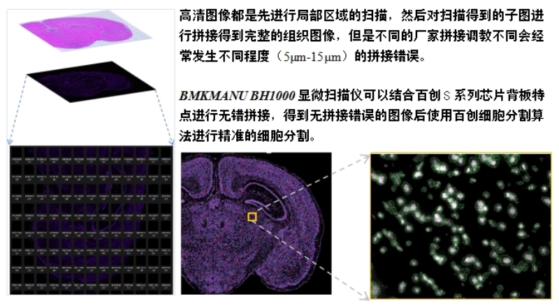 可以利用BH1000對明場及熒光掃描過程中經常出現(xiàn)的拼接錯誤進行校準(自主研發(fā)BMCHiper軟件,搭配自研半透半返模塊,實現(xiàn)圖像無錯校準),得到原片無錯高清的熒光圖像與原片無錯高清的明場圖像,為后續(xù)空間數(shù)據(jù)準確的定位和可視化提供基礎,使得復雜的轉錄組數(shù)據(jù)能夠轉化為最直觀,最精準的生物學見解。