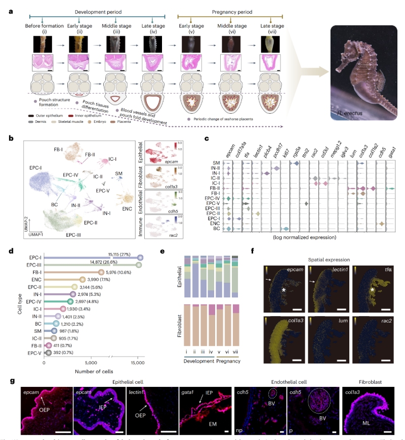 近日,?中國(guó)科學(xué)院南海海洋研究所林強(qiáng)研究員團(tuán)隊(duì)聯(lián)合德國(guó)康斯坦茨大學(xué)等機(jī)構(gòu)在海龍科魚類“雄性懷孕”的適應(yīng)進(jìn)化與分子調(diào)控機(jī)制取得突破性進(jìn)展,相關(guān)研究成果以?“Cellular?and?molecular?mechanisms?of?seahorse?male?pregnancy”?為題發(fā)表于國(guó)際著名期刊Nature?Ecology?&?Evolution。該研究聚焦海龍科魚類中雄性承擔(dān)懷孕職責(zé)的特殊繁殖策略,系統(tǒng)揭示了其育兒袋形成、胚胎營(yíng)養(yǎng)與免疫保護(hù)等關(guān)鍵生理過程的細(xì)胞和分子基礎(chǔ)。百邁客生物為該研究提供了百創(chuàng)空間轉(zhuǎn)錄組BMKMANU?S1000服務(wù)。
