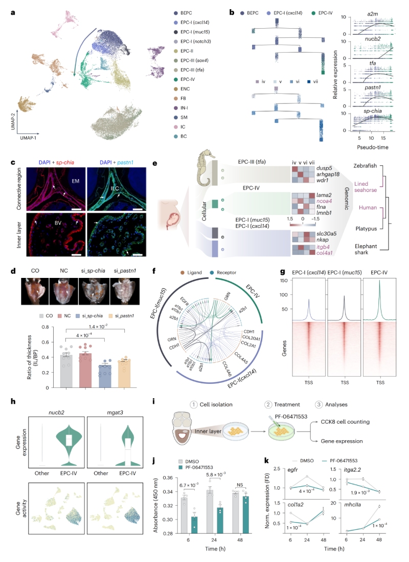 對(duì)海馬育兒袋7個(gè)發(fā)育階段進(jìn)行單細(xì)胞轉(zhuǎn)錄組測(cè)序,鑒定出14個(gè)細(xì)胞簇,分為四大主要細(xì)胞類型:上皮細(xì)胞(EPCs,9個(gè)簇)、成纖維細(xì)胞(FBs,2個(gè)簇)、免疫細(xì)胞(ICs,2個(gè)簇)和內(nèi)皮細(xì)胞(ENCs,1個(gè)簇)。細(xì)胞的空間分布對(duì)細(xì)胞間相互作用及其功能維持至關(guān)重要。