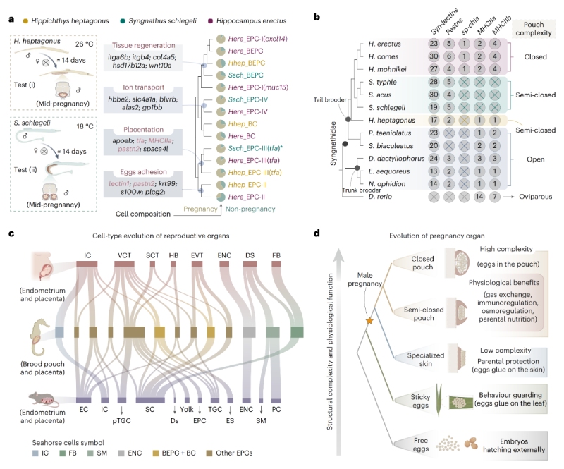 胎生是脊椎動(dòng)物中廣泛存在的一種生殖策略,其特征為受精卵在母體內(nèi)發(fā)育,直至胚胎發(fā)育成熟后才被產(chǎn)出。與這一普遍模式形成鮮明對(duì)比的是,海馬科物種演化出了極為特殊的“雄性懷孕”現(xiàn)象,該獨(dú)特的生命史策略為研究動(dòng)物生殖系統(tǒng)的演化提供了重要窗口:功能性相似的生殖方式究竟源于趨同的分子機(jī)制,抑或是通過同源通路或全新的細(xì)胞調(diào)控路徑實(shí)現(xiàn)?盡管已有比較基因組學(xué)研究初步揭示了該生殖方式轉(zhuǎn)變的遺傳背景,然而相關(guān)基因在特定細(xì)胞類型中的表達(dá)模式及其演化軌跡仍不清楚。
