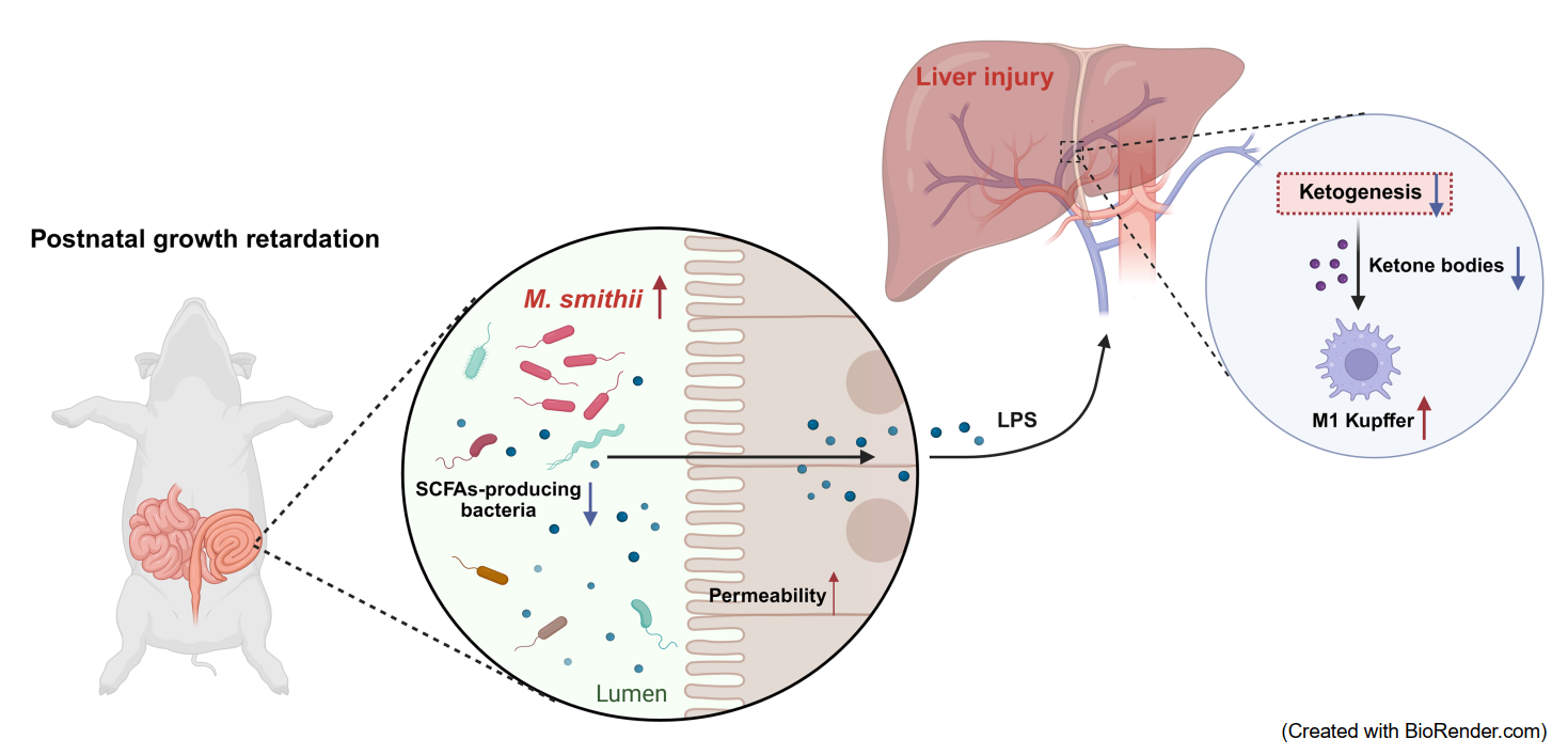 該研究通過(guò)系統(tǒng)深入的實(shí)驗(yàn),最終揭示了“M. smithii—肝臟酮體代謝—肝臟免疫”的調(diào)控軸在仔豬生長(zhǎng)遲緩中的核心作用:PGR仔豬后腸富集的M. smithii與低豐度的短酸生成菌共同作用,一方面抑制肝臟酮體代謝功能,減少β-羥基丁酸生成;另一方面增加腸道通透性,通過(guò)腸肝循環(huán)引發(fā)肝臟枯否細(xì)胞M1型極化與炎癥反應(yīng),加劇肝臟損傷,最終導(dǎo)致仔豬生長(zhǎng)受限。而抑制M. smithii定植或外源補(bǔ)充β-羥基丁酸,均可有效逆轉(zhuǎn)生長(zhǎng)遲緩表型。
