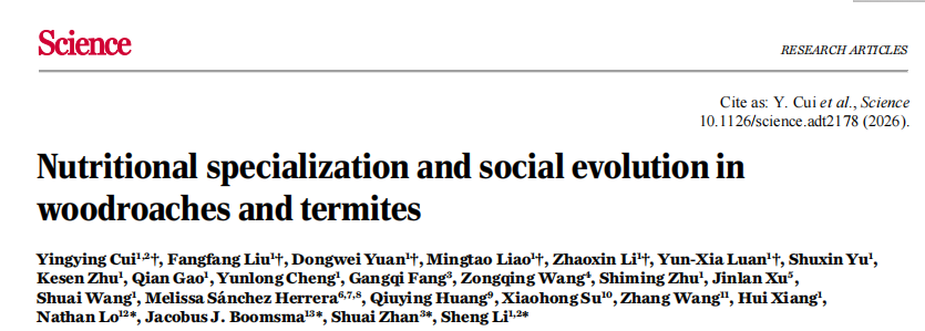 2026年01月29日,華南師范大學生命科學學院昆蟲科學與技術研究所李勝教授團隊聯(lián)合中國科學院分子植物科學卓越創(chuàng)新中心詹帥團隊等在Science發(fā)表研究論文,題為“Nutritional?specialization?and?social?evolution?in?woodroaches?and?termites”。