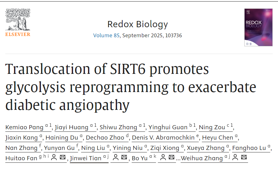 哈爾濱醫(yī)科大學張偉華教授和李水潔教授、哈爾濱醫(yī)科大學附屬第二醫(yī)院于波教授和田進偉教授以及哈爾濱醫(yī)科大學附屬第一醫(yī)院范會濤教授在Redox Biology上發(fā)表題為“Translocation of SIRT6 promotes glycolysis reprogramming to exacerbate diabetic angiopathy”的研究論文。