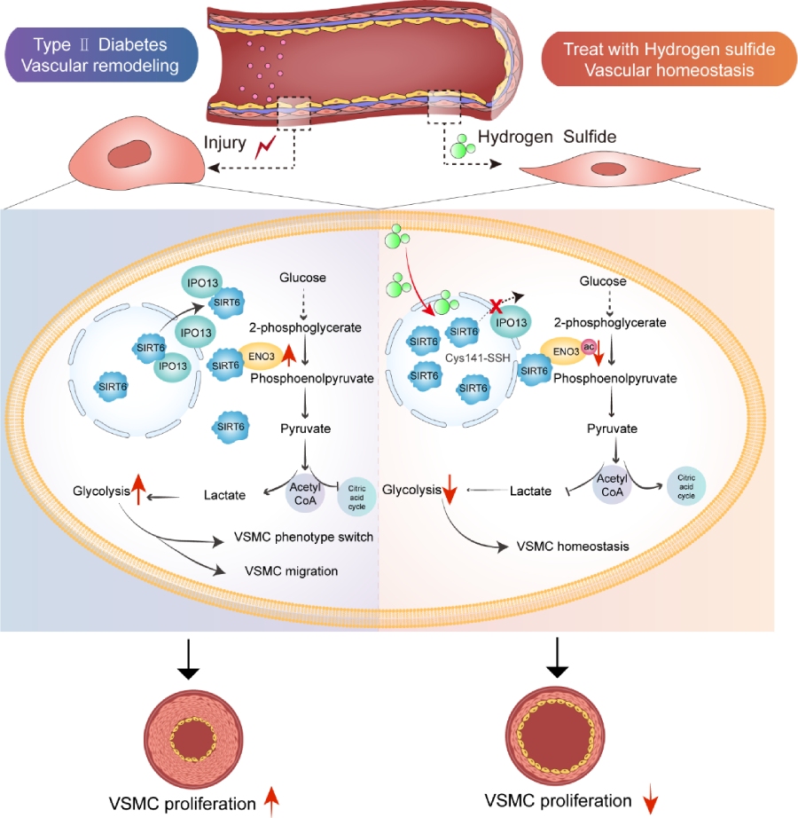 總體而言,該研究通過整合多組學分析、動物模型驗證和細胞功能實驗,全面揭示了細胞質(zhì)SIRT6-ENO3軸調(diào)節(jié)糖酵解重編程和VSMC增殖相關(guān)血管重塑的新機制。研究發(fā)現(xiàn)高血糖和高血脂通過氧化應(yīng)激和IPO13依賴的核輸出過程促進SIRT6細胞質(zhì)易位,易位的SIRT6通過去乙?;疎NO3增強其酶活性,驅(qū)動糖酵解重編程和血管平滑肌細胞異常增殖。更重要的是,外源性硫化氫通過恢復SIRT6第141位半胱氨酸的S-硫氫化修飾,抑制其細胞質(zhì)易位并減弱ENO3活性,從而改善糖尿病血管病變。